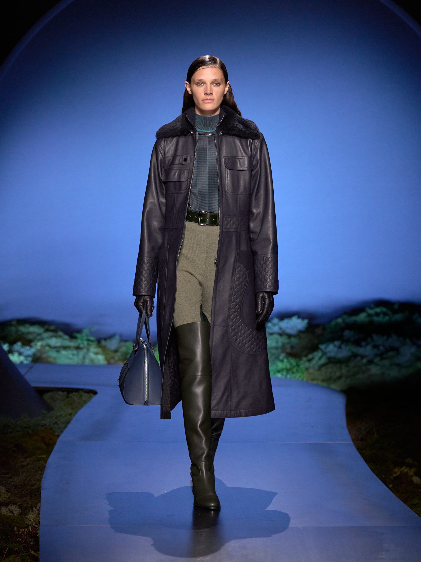 Jumpsuit aderenti, cappotti con inseti in pelle matelassé e giacche sciancrate sfilano alla Paris Fashion Week sulla passerella Autunno/Inverno 2026-2027 di Hermes