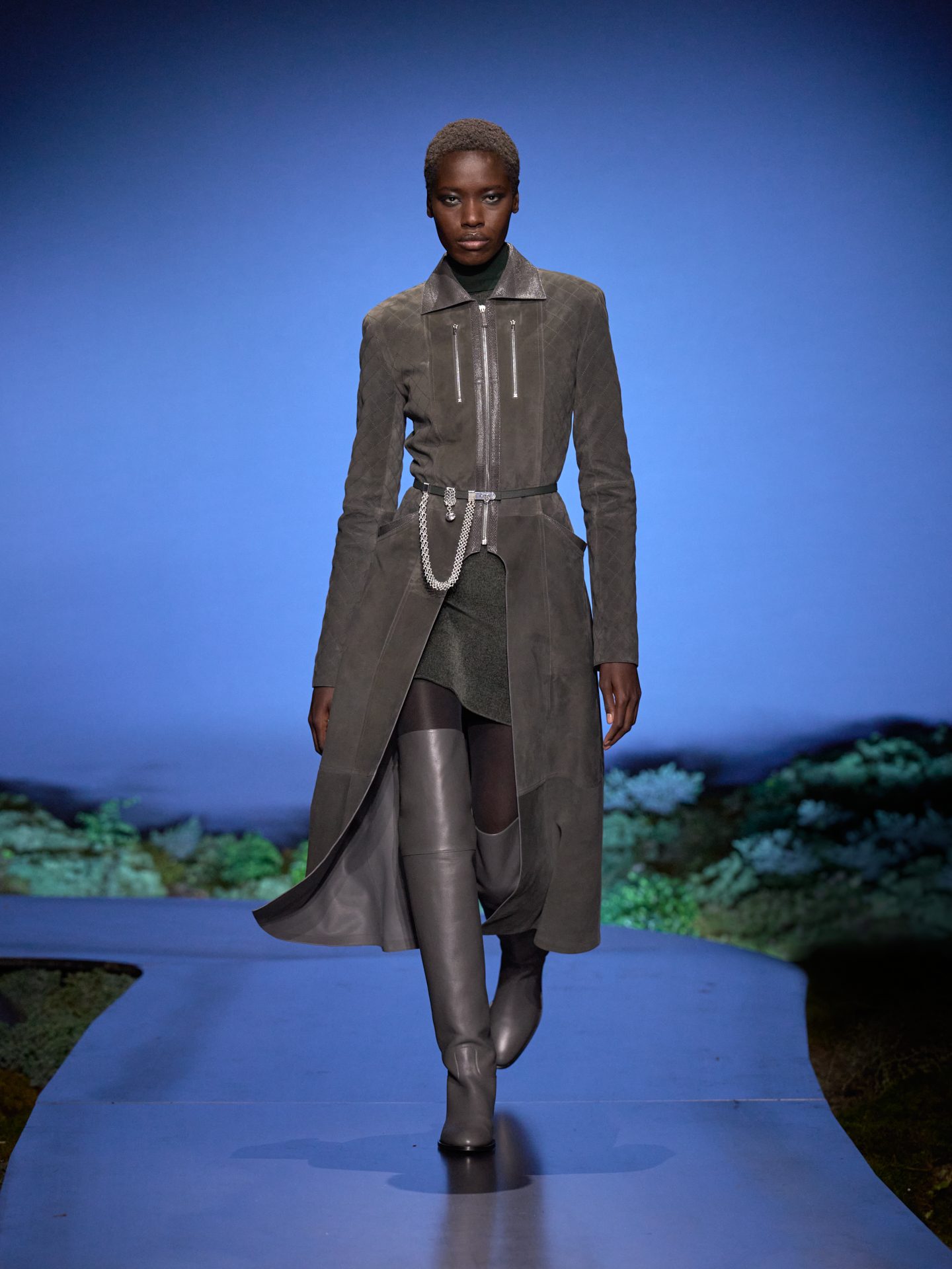 Jumpsuit aderenti, cappotti con inseti in pelle matelassé e giacche sciancrate sfilano alla Paris Fashion Week sulla passerella Autunno/Inverno 2026-2027 di Hermes