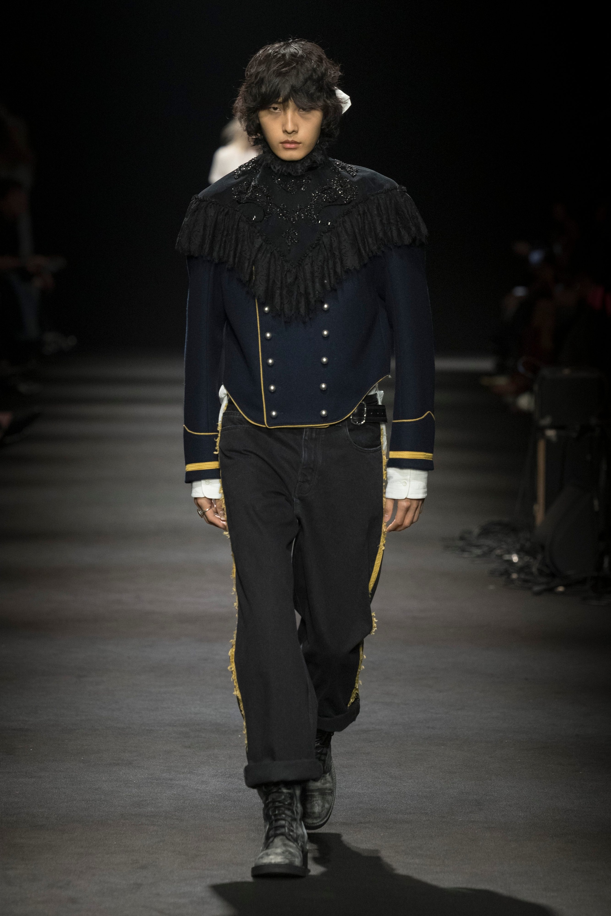 Abiti dal mood gotico, dettagli in pizzo mescolati con cappotti d'ispirazione militare e t-shirt a stampa sfilano alla Paris Fashion Week sulla passerella Autunno/Inverno 2026-2027 di Ann Demeulemeester