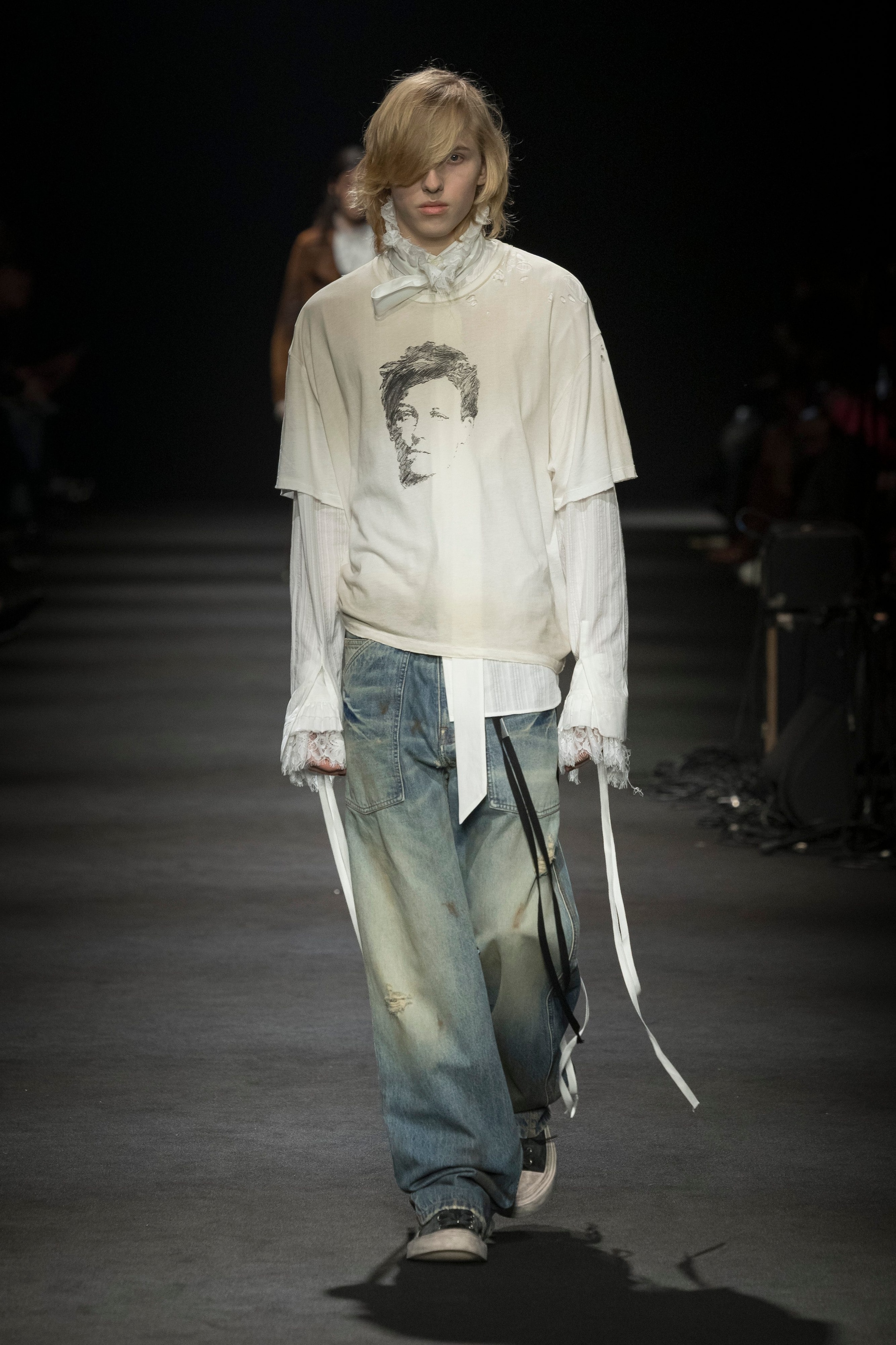 Abiti dal mood gotico, dettagli in pizzo mescolati con cappotti d'ispirazione militare e t-shirt a stampa sfilano alla Paris Fashion Week sulla passerella Autunno/Inverno 2026-2027 di Ann Demeulemeester