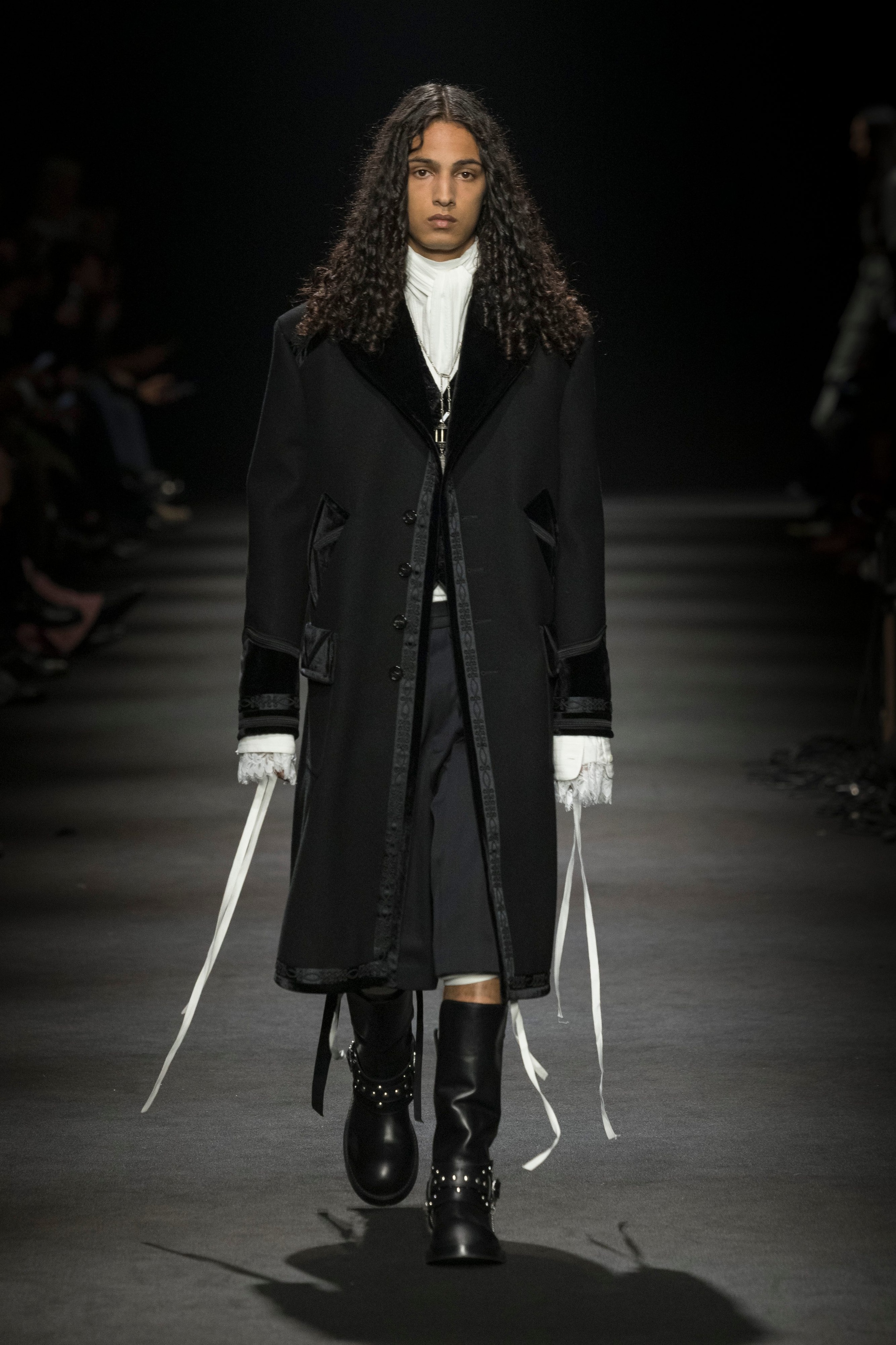 Abiti dal mood gotico, dettagli in pizzo mescolati con cappotti d'ispirazione militare e t-shirt a stampa sfilano alla Paris Fashion Week sulla passerella Autunno/Inverno 2026-2027 di Ann Demeulemeester