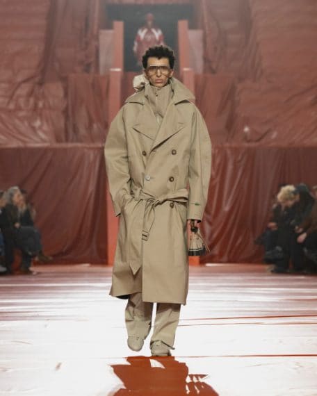 Trench rivisitati e completi monocolore, felpe extra large e maglioni crop a trecce sfilano alla Paris Fashion Week sulla passerella Autunno/Inverno 2026-2027 di Lacoste.