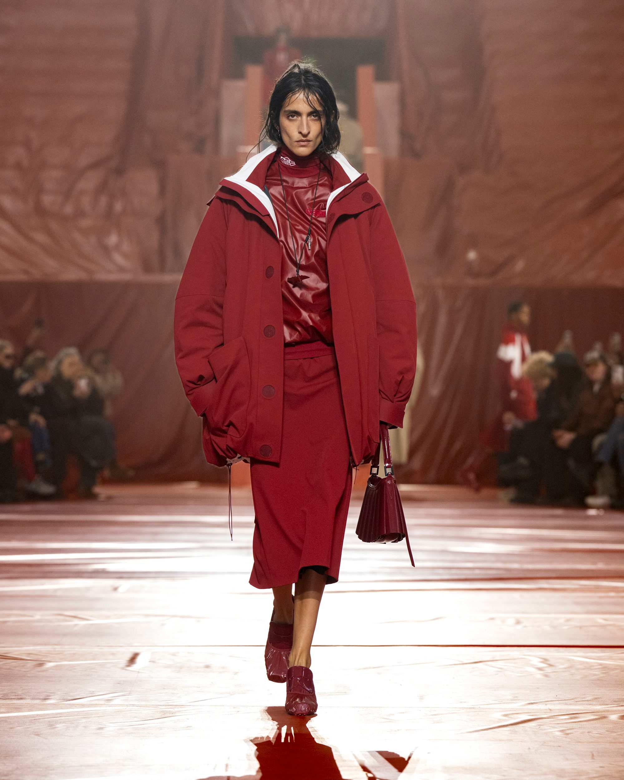 Trench rivisitati e completi monocolore, felpe extra large e maglioni crop a trecce sfilano alla Paris Fashion Week sulla passerella Autunno/Inverno 2026-2027 di Lacoste.