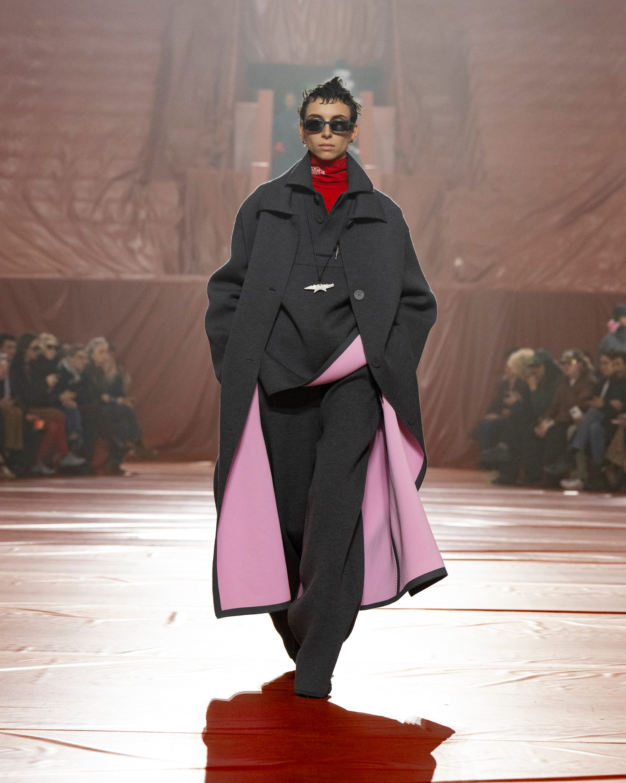 Trench rivisitati e completi monocolore, felpe extra large e maglioni crop a trecce sfilano alla Paris Fashion Week sulla passerella Autunno/Inverno 2026-2027 di Lacoste.