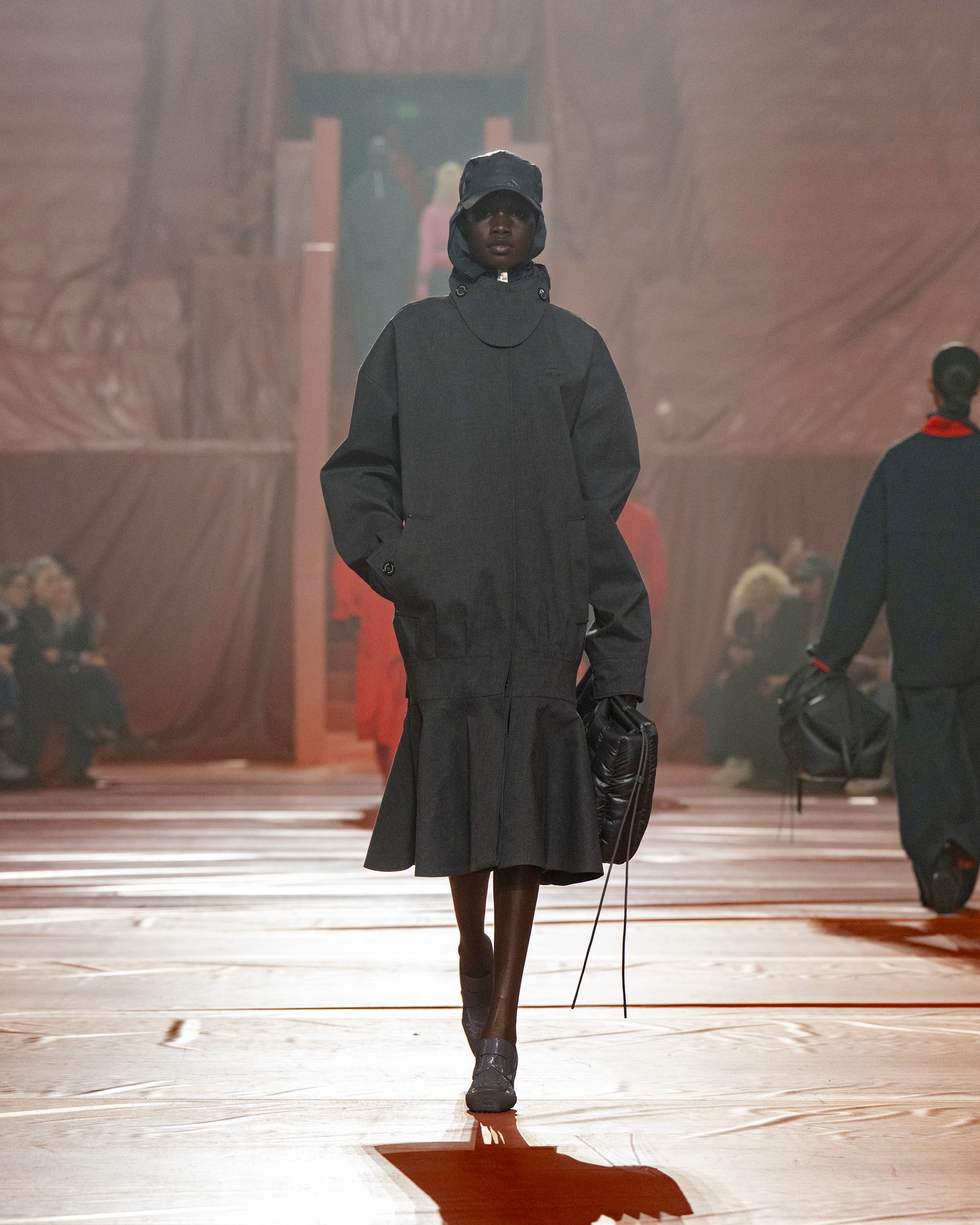 Trench rivisitati e completi monocolore, felpe extra large e maglioni crop a trecce sfilano alla Paris Fashion Week sulla passerella Autunno/Inverno 2026-2027 di Lacoste.