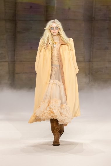 Lunghi abiti dalla stampa a quadri, look in stile folk, cappe e outfit colorati sfilano alla Paris Fashion Week sulla passerella Autunno/Inverno 2026-2027 di Chloé