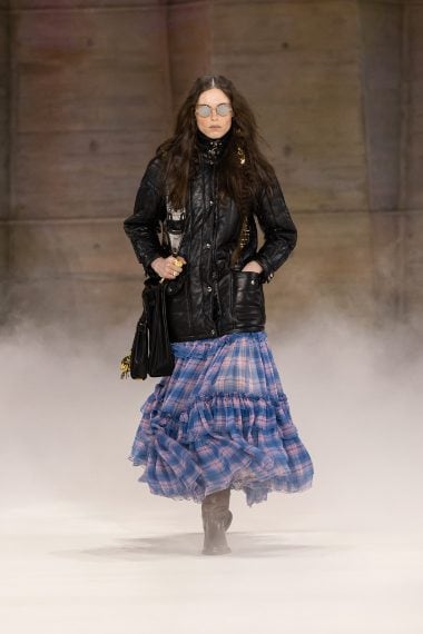 Lunghi abiti dalla stampa a quadri, look in stile folk, cappe e outfit colorati sfilano alla Paris Fashion Week sulla passerella Autunno/Inverno 2026-2027 di Chloé
