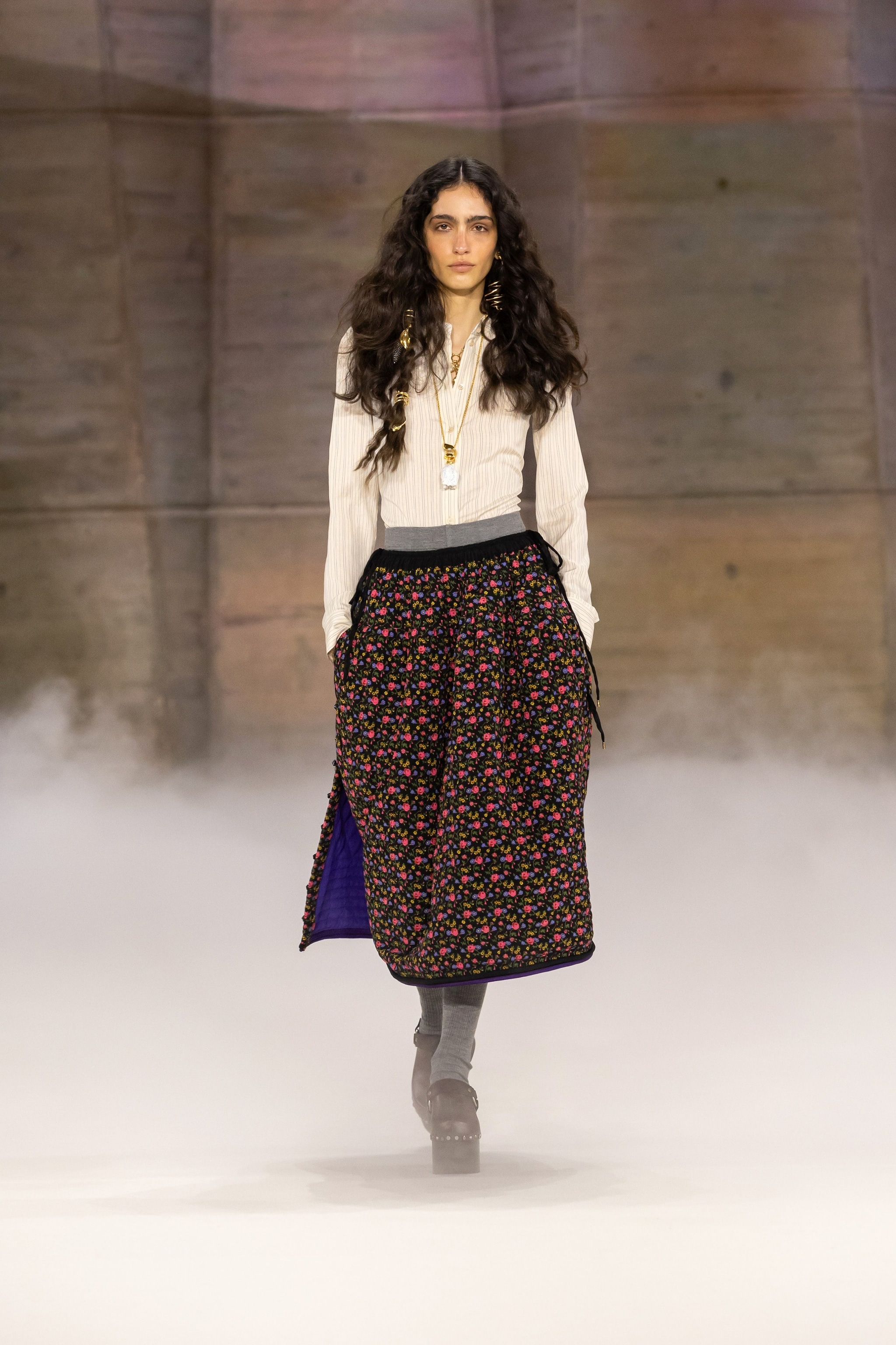 Lunghi abiti dalla stampa a quadri, look in stile folk, cappe e outfit colorati sfilano alla Paris Fashion Week sulla passerella Autunno/Inverno 2026-2027 di Chloé