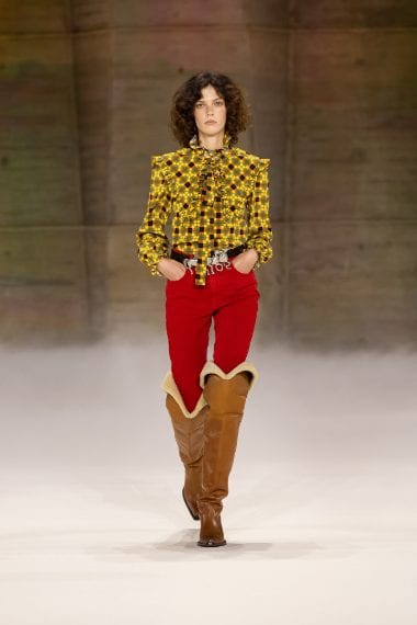 Lunghi abiti dalla stampa a quadri, look in stile folk, cappe e outfit colorati sfilano alla Paris Fashion Week sulla passerella Autunno/Inverno 2026-2027 di Chloé