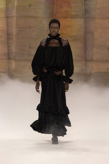 Lunghi abiti dalla stampa a quadri, look in stile folk, cappe e outfit colorati sfilano alla Paris Fashion Week sulla passerella Autunno/Inverno 2026-2027 di Chloé