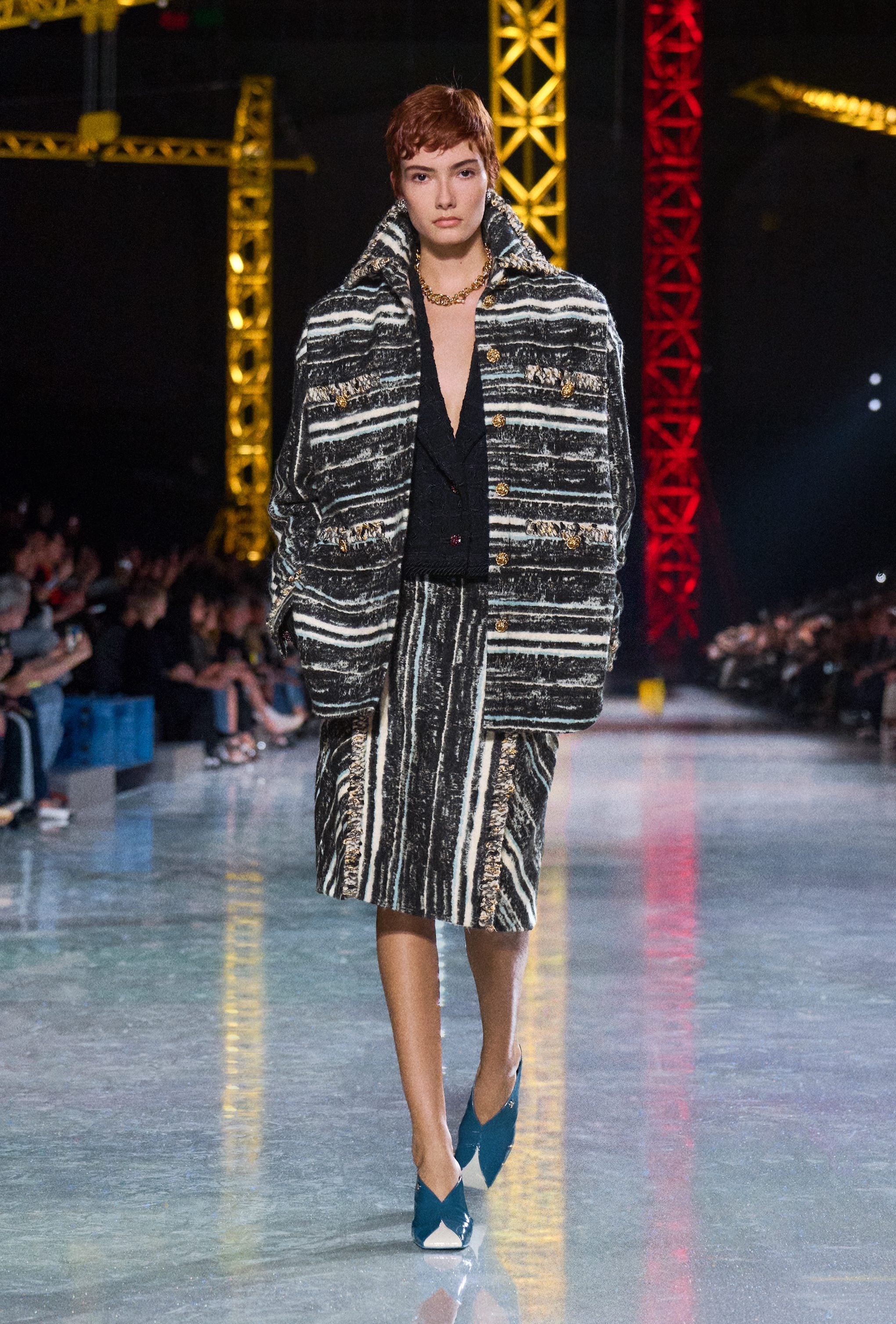 Abiti in seta o coperti di macro paillettes, completi in lana, fantasie a quadri maxi blazer e gonne a vita bassissima sfilano alla Paris Fashion Week sulla passerella Autunno/Inverno 2026-2027 di Chanel