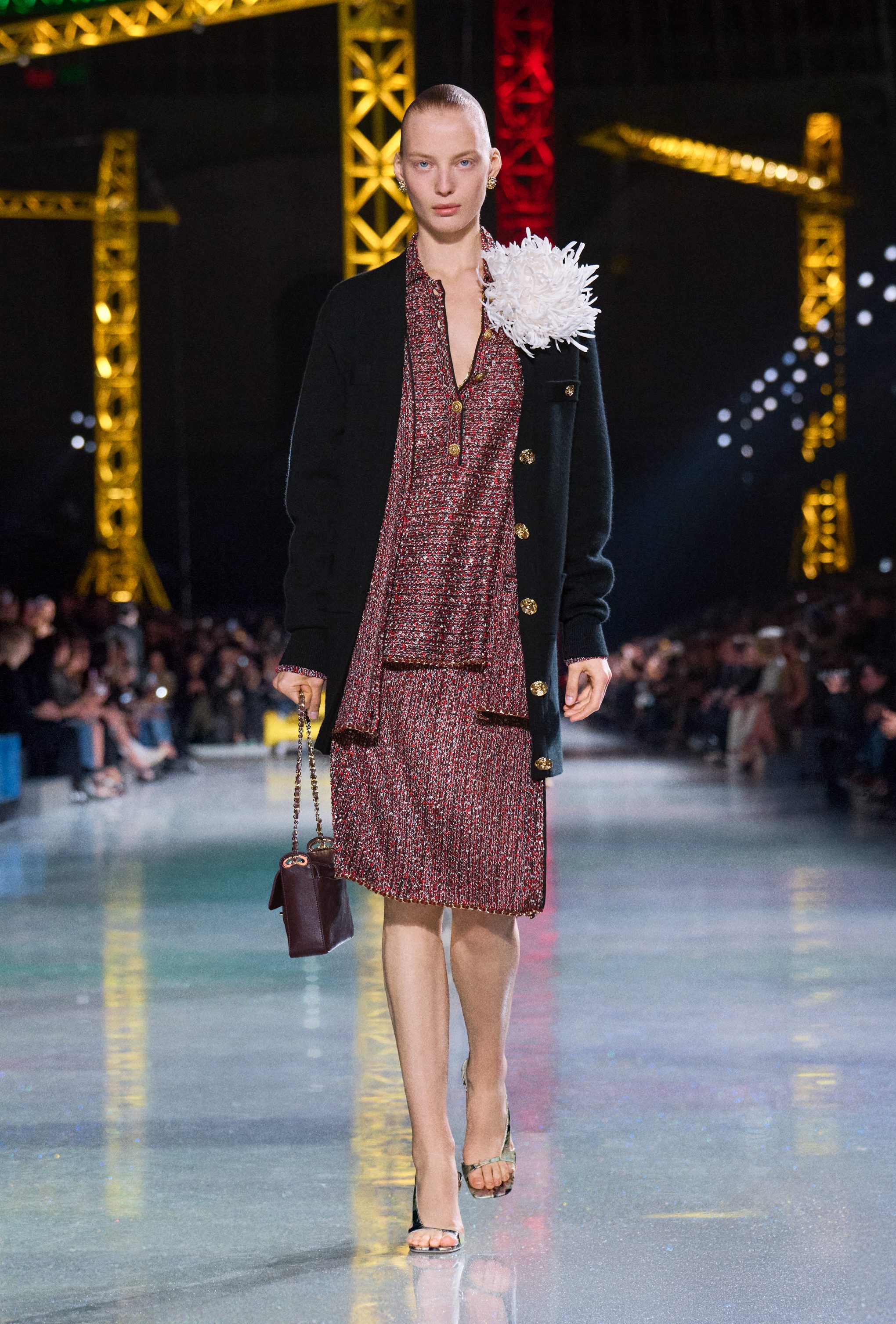 Abiti in seta o coperti di macro paillettes, completi in lana, fantasie a quadri maxi blazer e gonne a vita bassissima sfilano alla Paris Fashion Week sulla passerella Autunno/Inverno 2026-2027 di Chanel