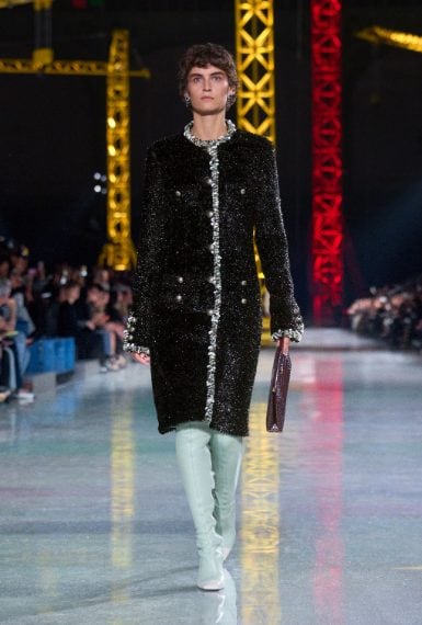 Abiti in seta o coperti di macro paillettes, completi in lana, fantasie a quadri maxi blazer e gonne a vita bassissima sfilano alla Paris Fashion Week sulla passerella Autunno/Inverno 2026-2027 di Chanel