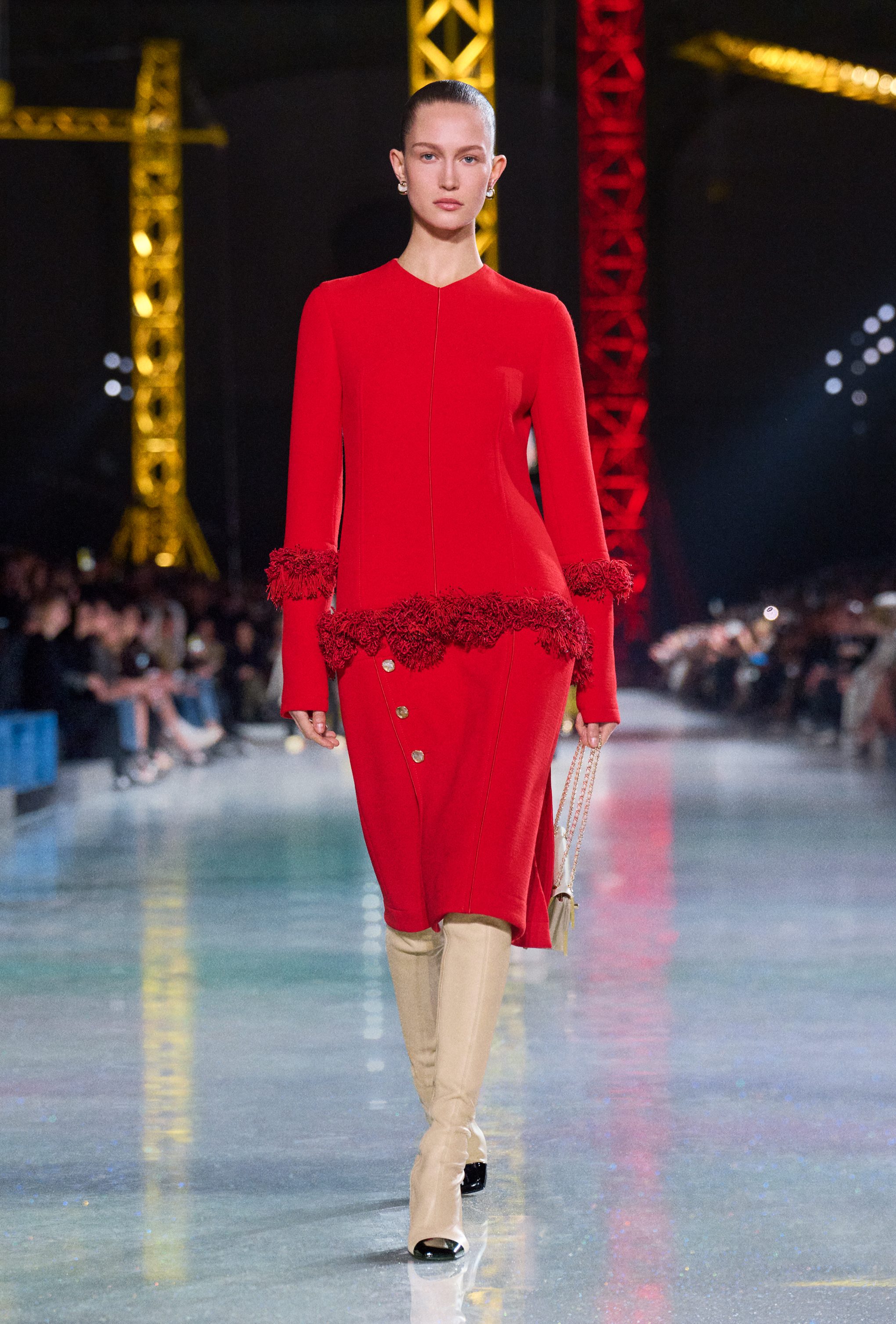 Abiti in seta o coperti di macro paillettes, completi in lana, fantasie a quadri maxi blazer e gonne a vita bassissima sfilano alla Paris Fashion Week sulla passerella Autunno/Inverno 2026-2027 di Chanel