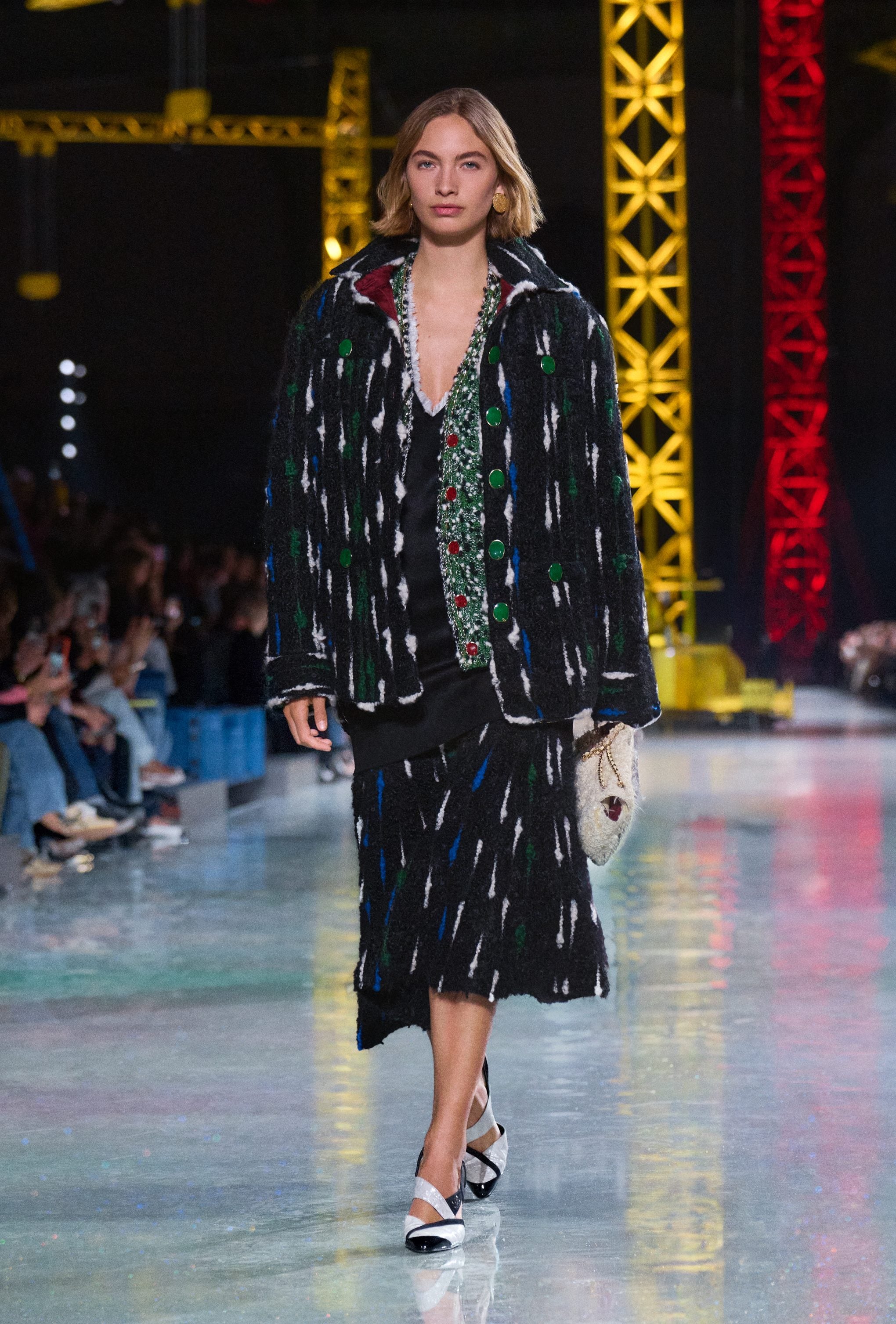 Abiti in seta o coperti di macro paillettes, completi in lana, fantasie a quadri maxi blazer e gonne a vita bassissima sfilano alla Paris Fashion Week sulla passerella Autunno/Inverno 2026-2027 di Chanel