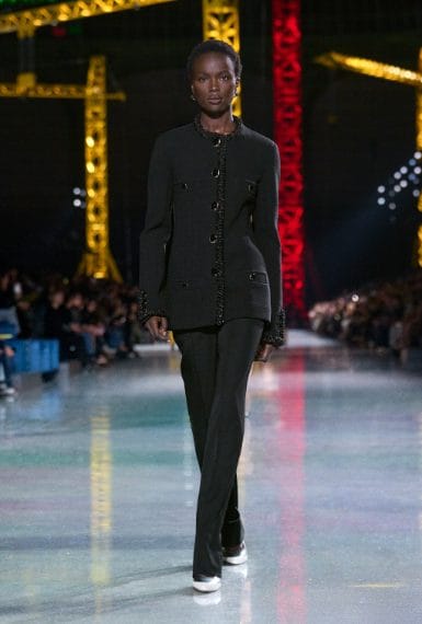 Abiti in seta o coperti di macro paillettes, completi in lana, fantasie a quadri maxi blazer e gonne a vita bassissima sfilano alla Paris Fashion Week sulla passerella Autunno/Inverno 2026-2027 di Chanel