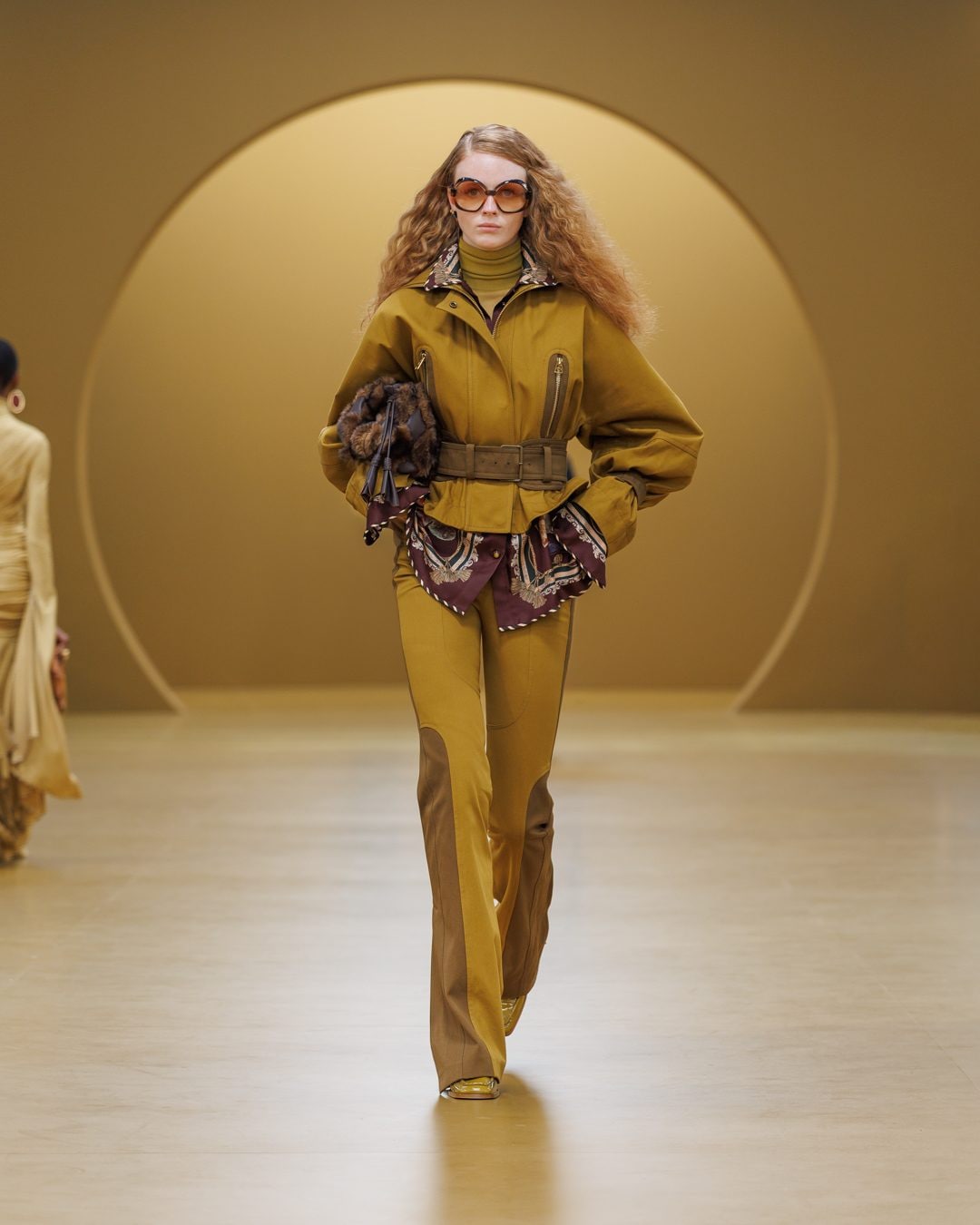 Abiti foulard, trench in denim e coprispalle in pelliccia eco sfilano alla Paris Fashion Week sulla passerella Autunno/Inverno 2026-2027 di Zimmermann