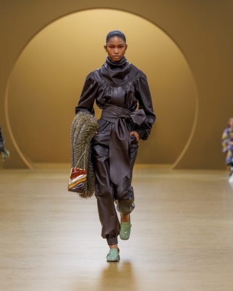 Abiti foulard, trench in denim e coprispalle in pelliccia eco sfilano alla Paris Fashion Week sulla passerella Autunno/Inverno 2026-2027 di Zimmermann