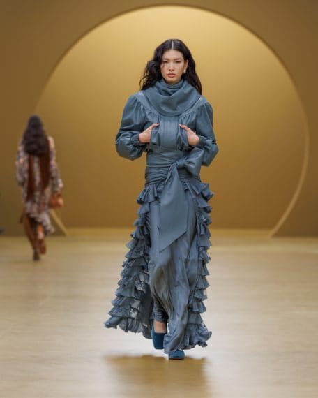 Abiti foulard, trench in denim e coprispalle in pelliccia eco sfilano alla Paris Fashion Week sulla passerella Autunno/Inverno 2026-2027 di Zimmermann