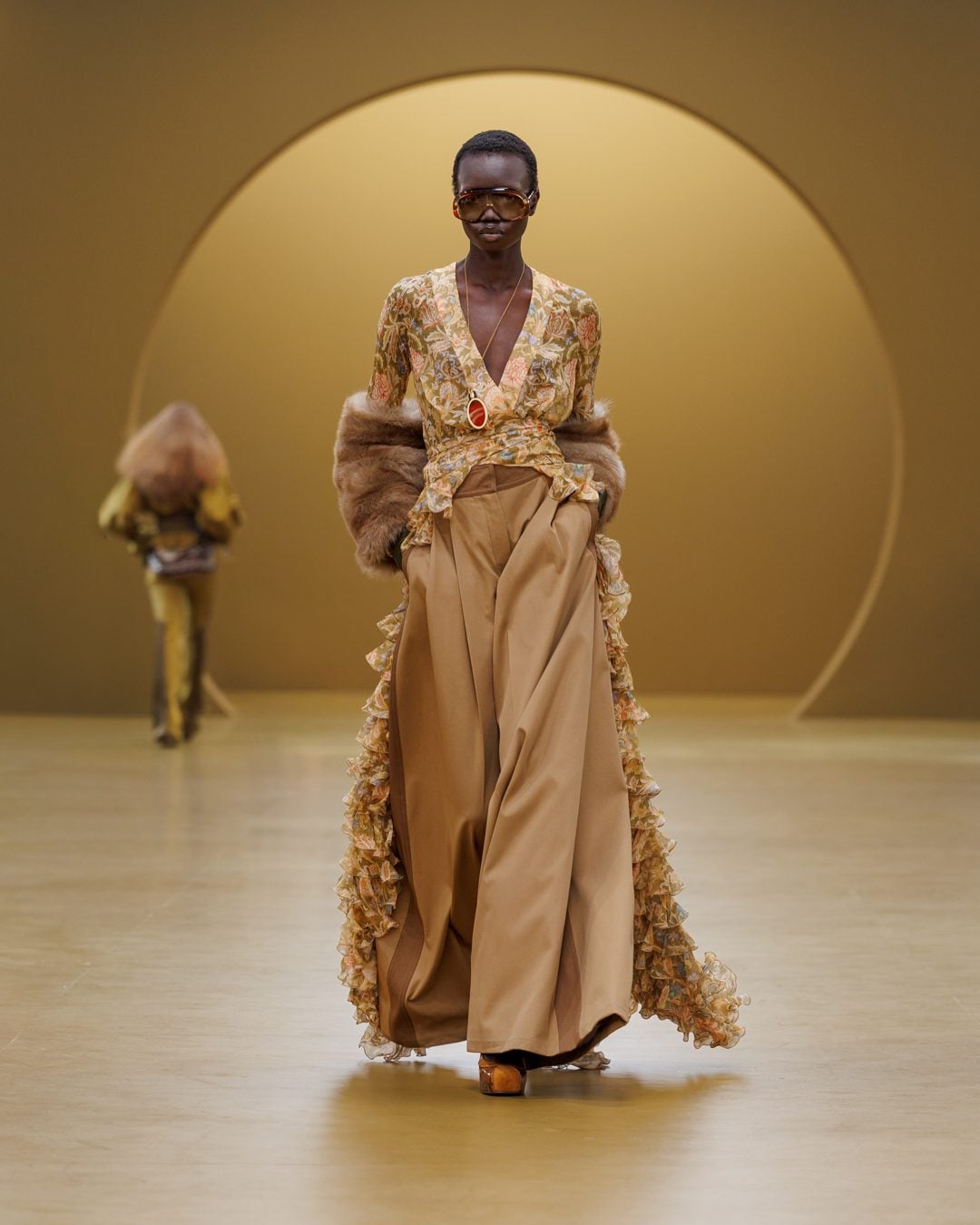 Abiti foulard, trench in denim e coprispalle in pelliccia eco sfilano alla Paris Fashion Week sulla passerella Autunno/Inverno 2026-2027 di Zimmermann