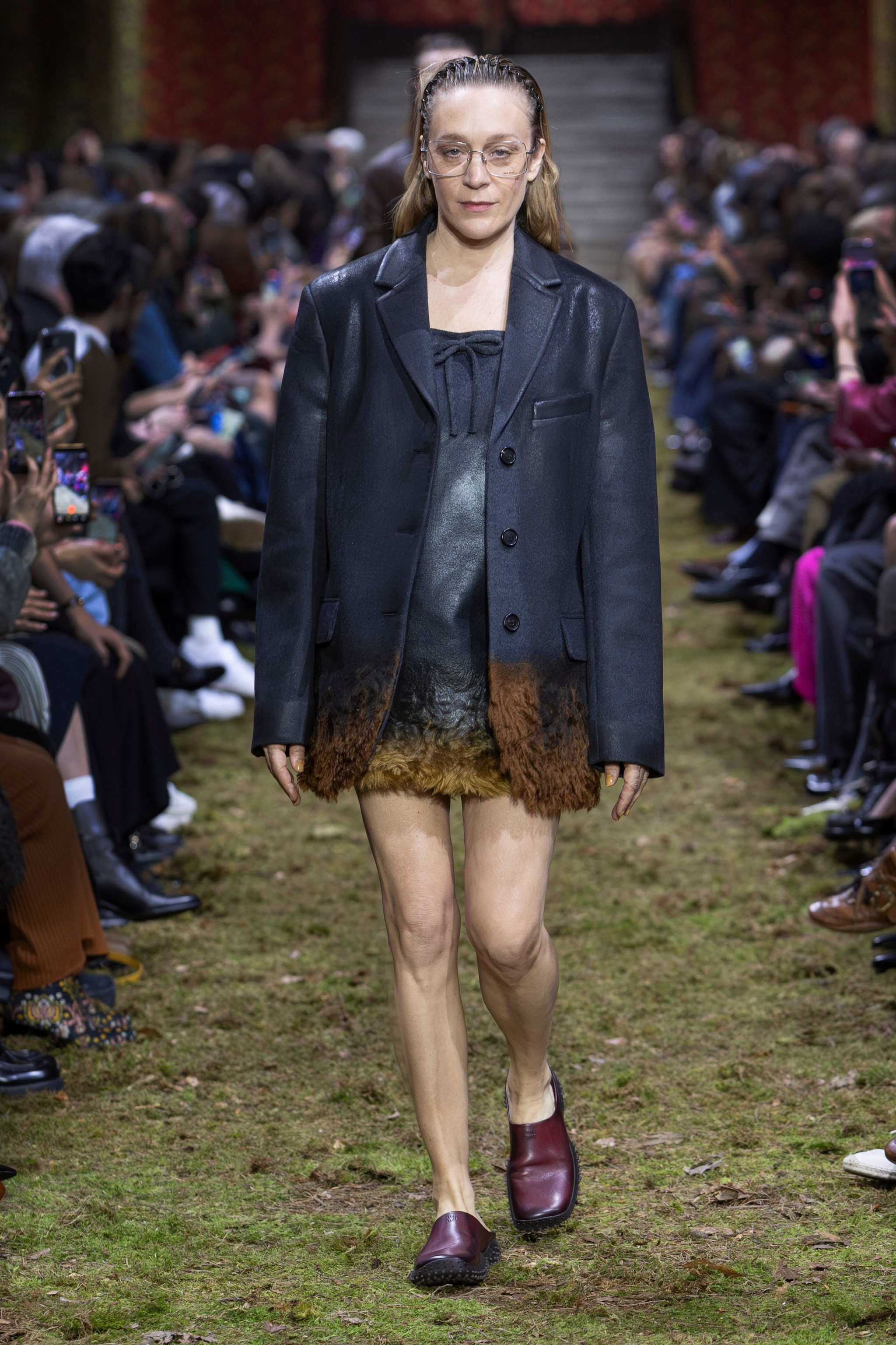 Completi minimal, blazer con agugliatura che unisce pelle e lana, mini dress essenziali con mini fiocchi e leather look sfilano alla Paris Fashion Week sulla passerella Autunno/Inverno 2026-2027 di Miu Miu