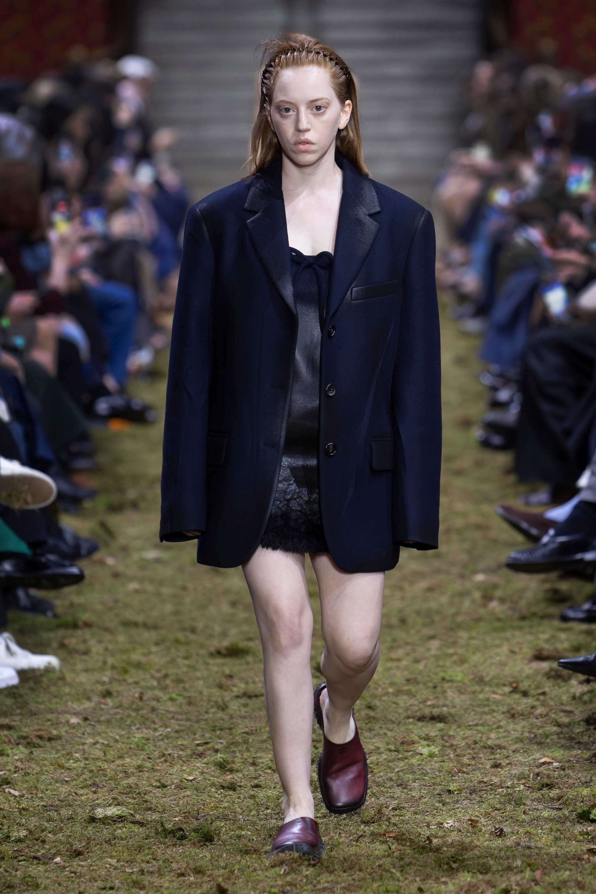 Completi minimal, blazer con agugliatura che unisce pelle e lana, mini dress essenziali con mini fiocchi e leather look sfilano alla Paris Fashion Week sulla passerella Autunno/Inverno 2026-2027 di Miu Miu