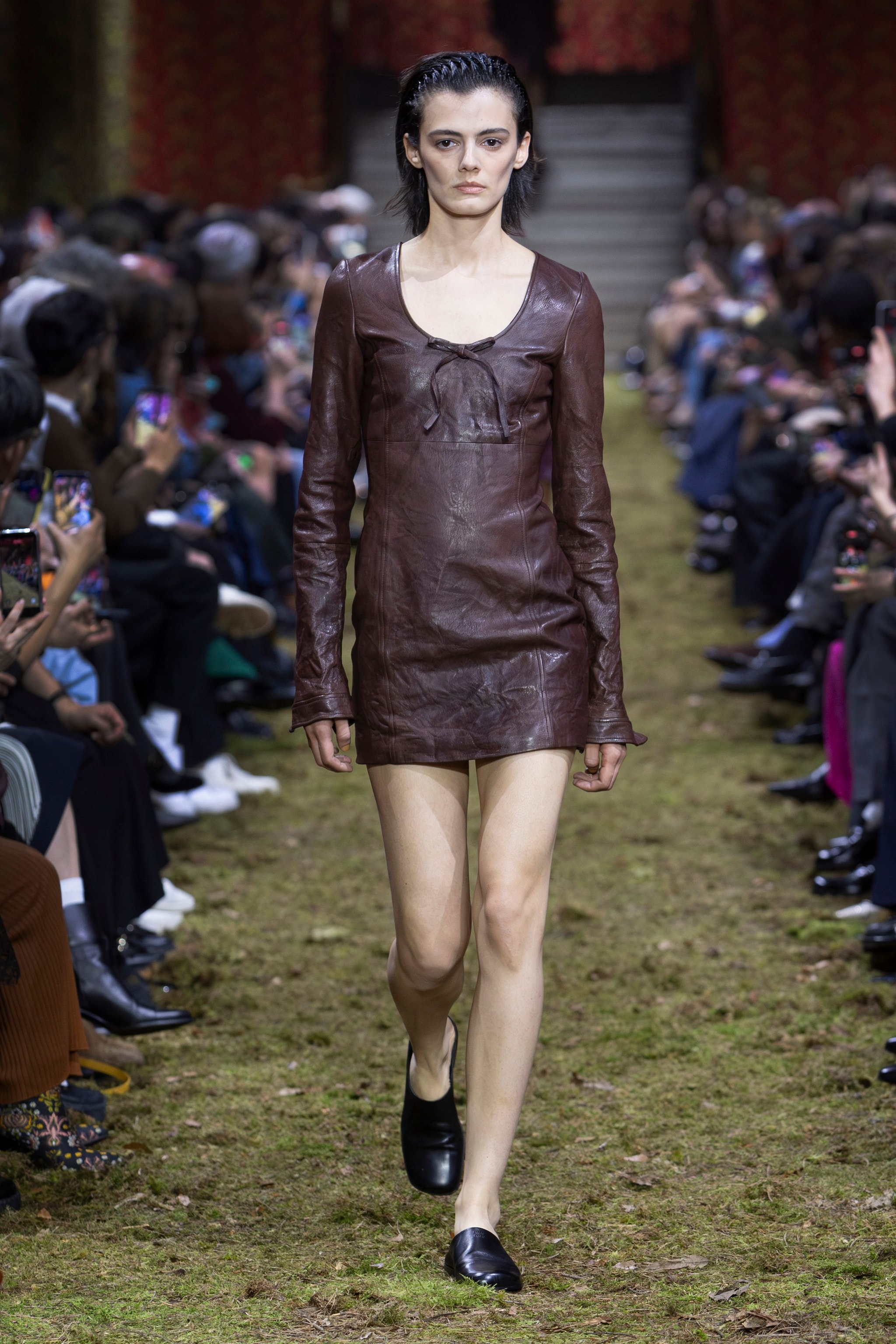 Completi minimal, blazer con agugliatura che unisce pelle e lana, mini dress essenziali con mini fiocchi e leather look sfilano alla Paris Fashion Week sulla passerella Autunno/Inverno 2026-2027 di Miu Miu