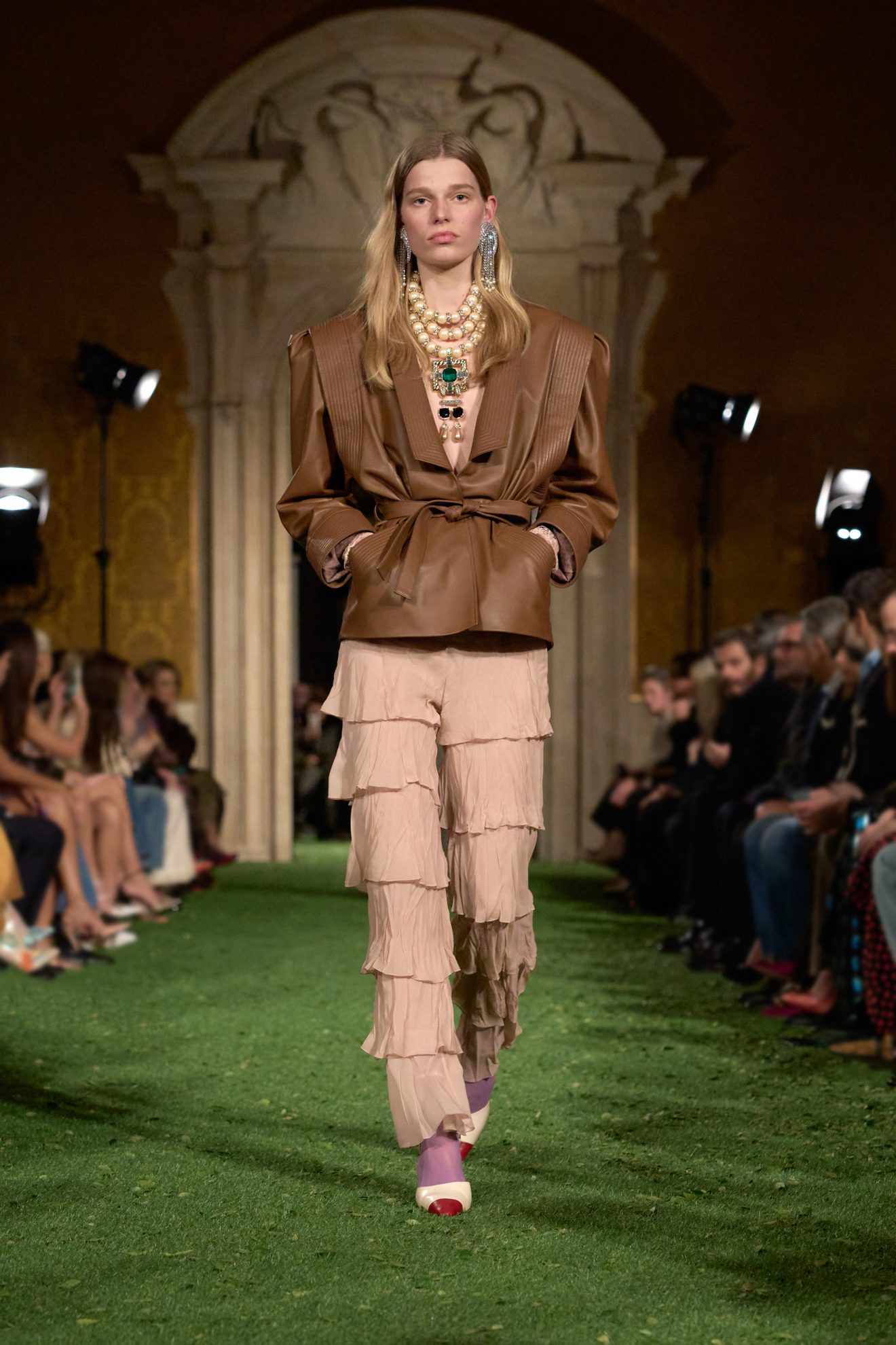 Abiti e giacche con spalline pronunciate dal mood anni '80, abbinamenti in color block, velluto, drappeggi nel tessuto e profili in pelliccia sfilano sulla passerella di Valentino nella collezione Autunno/Inverno 2026-2027 disegnata da Alessandro Michele
