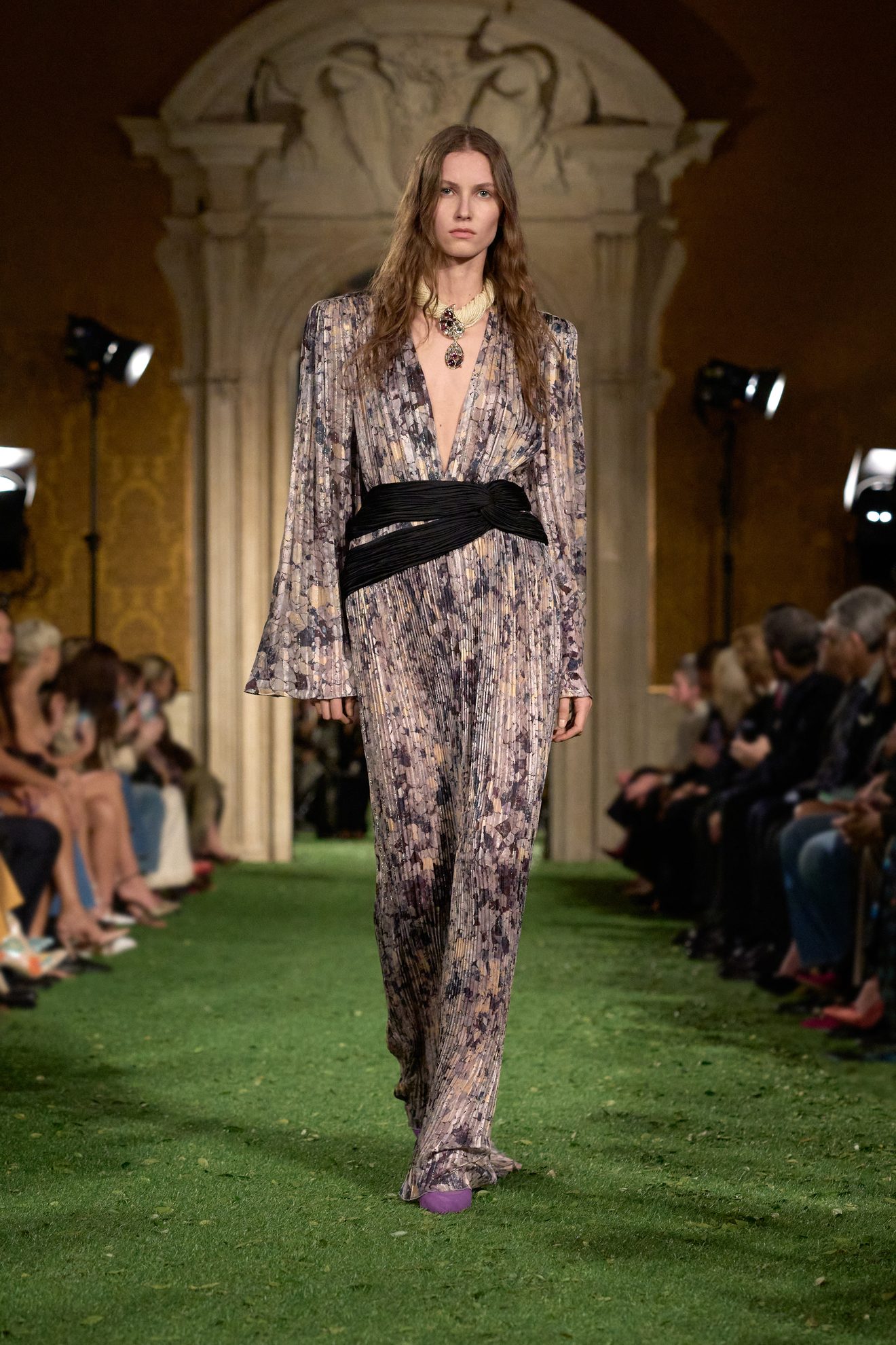Abiti e giacche con spalline pronunciate dal mood anni '80, abbinamenti in color block, velluto, drappeggi nel tessuto e profili in pelliccia sfilano sulla passerella di Valentino nella collezione Autunno/Inverno 2026-2027 disegnata da Alessandro Michele