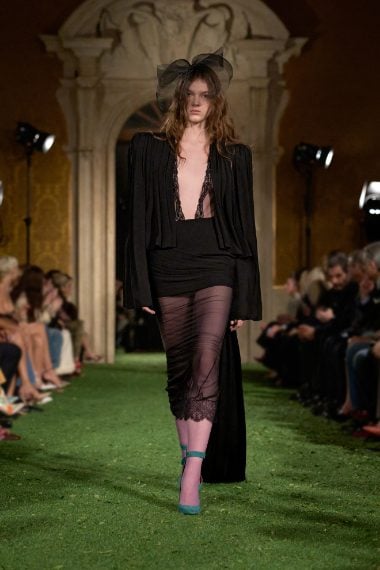 Abiti e giacche con spalline pronunciate dal mood anni '80, abbinamenti in color block, velluto, drappeggi nel tessuto e profili in pelliccia sfilano sulla passerella di Valentino nella collezione Autunno/Inverno 2026-2027 disegnata da Alessandro Michele
