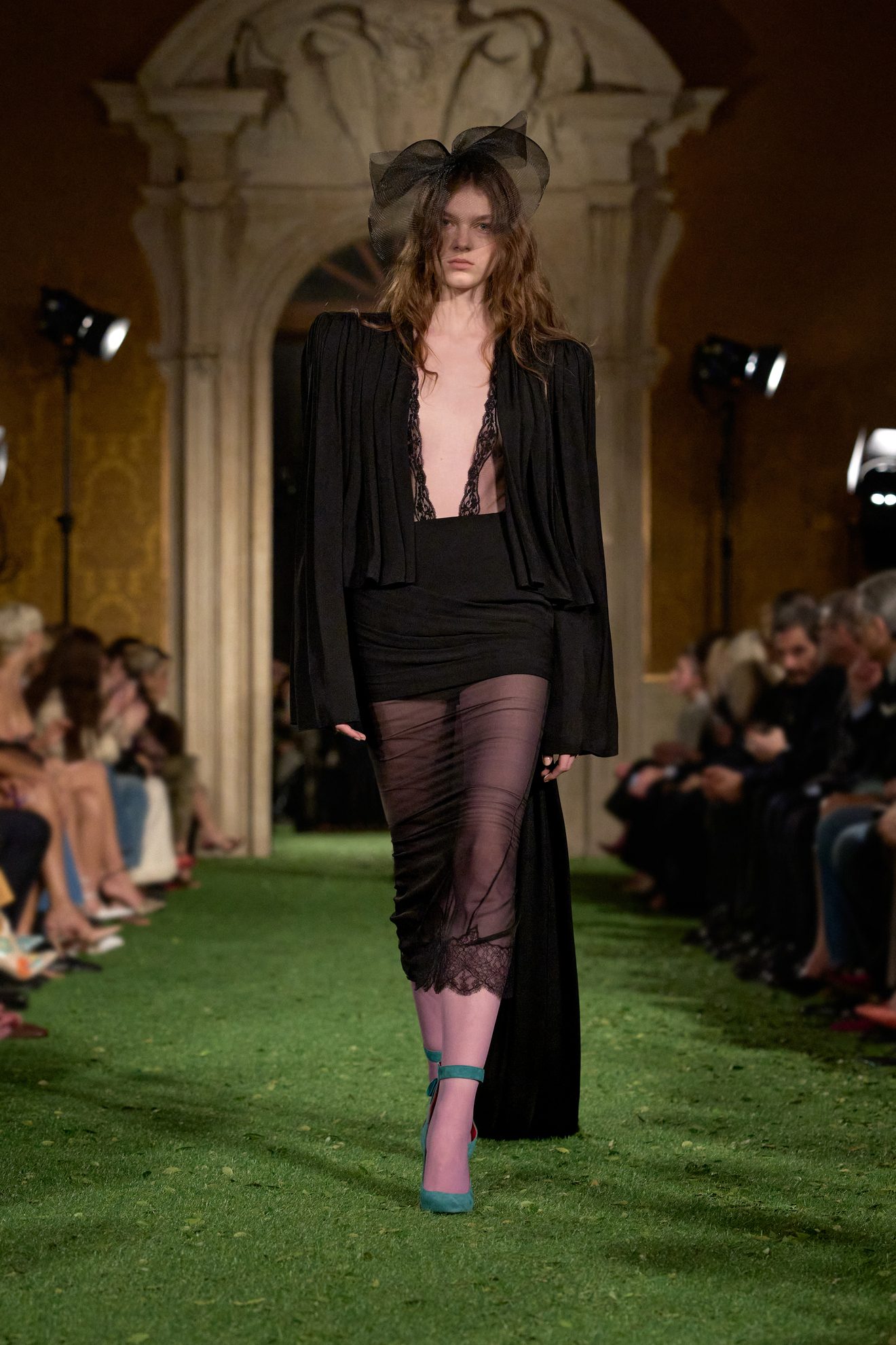 Abiti e giacche con spalline pronunciate dal mood anni '80, abbinamenti in color block, velluto, drappeggi nel tessuto e profili in pelliccia sfilano sulla passerella di Valentino nella collezione Autunno/Inverno 2026-2027 disegnata da Alessandro Michele