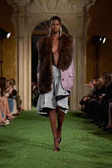 Abiti e giacche con spalline pronunciate dal mood anni '80, abbinamenti in color block, velluto, drappeggi nel tessuto e profili in pelliccia sfilano sulla passerella di Valentino nella collezione Autunno/Inverno 2026-2027 disegnata da Alessandro Michele