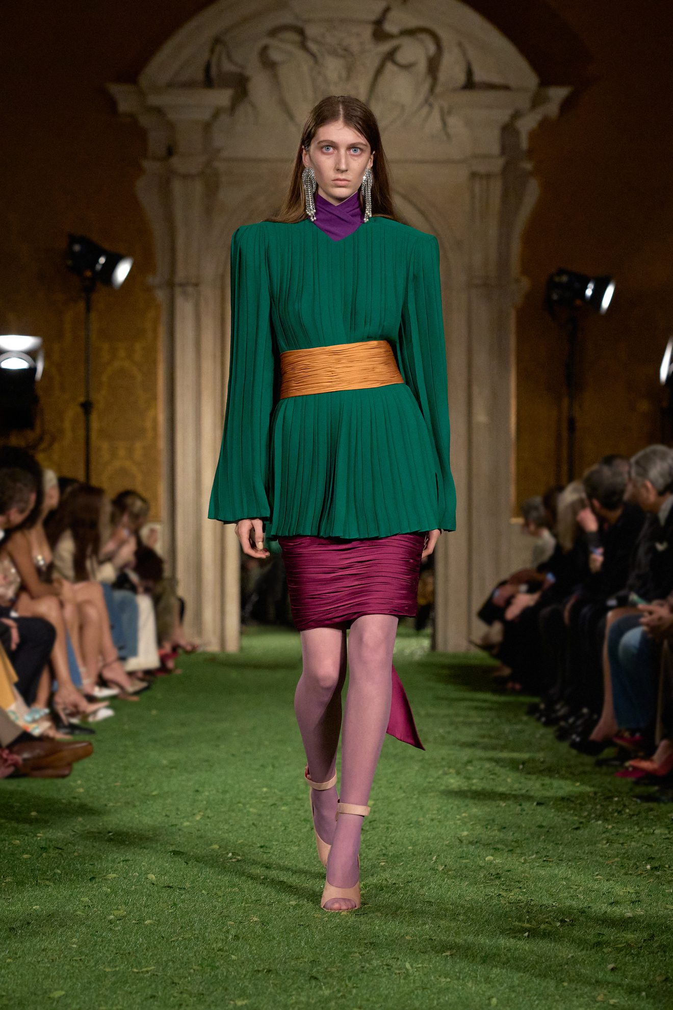 Abiti e giacche con spalline pronunciate dal mood anni '80, abbinamenti in color block, velluto, drappeggi nel tessuto e profili in pelliccia sfilano sulla passerella di Valentino nella collezione Autunno/Inverno 2026-2027 disegnata da Alessandro Michele