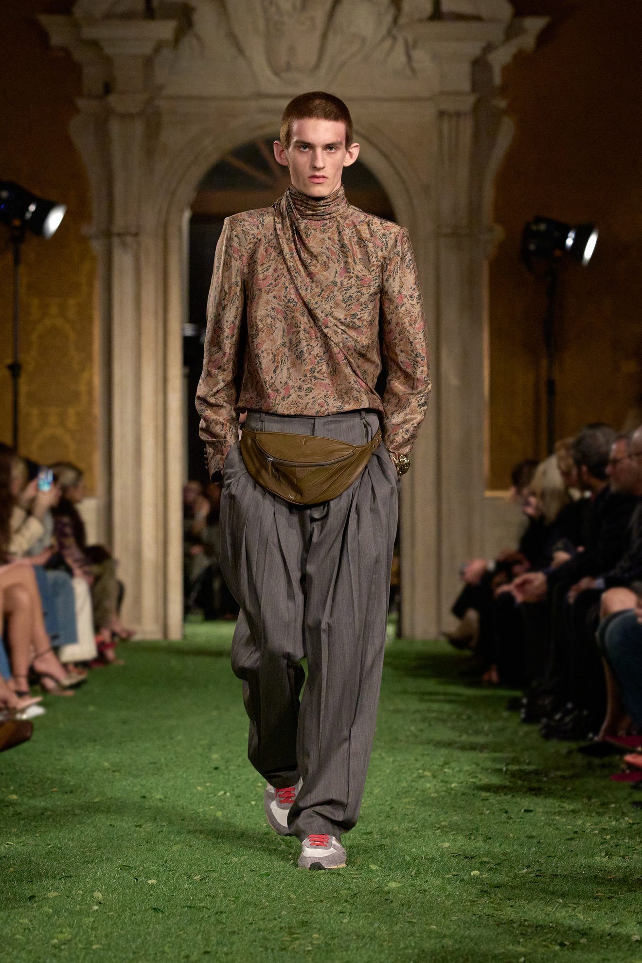 Abiti e giacche con spalline pronunciate dal mood anni '80, abbinamenti in color block, velluto, drappeggi nel tessuto e profili in pelliccia sfilano sulla passerella di Valentino nella collezione Autunno/Inverno 2026-2027 disegnata da Alessandro Michele