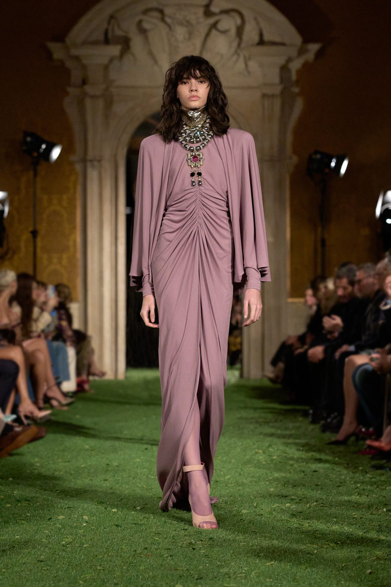 Abiti e giacche con spalline pronunciate dal mood anni '80, abbinamenti in color block, velluto, drappeggi nel tessuto e profili in pelliccia sfilano sulla passerella di Valentino nella collezione Autunno/Inverno 2026-2027 disegnata da Alessandro Michele