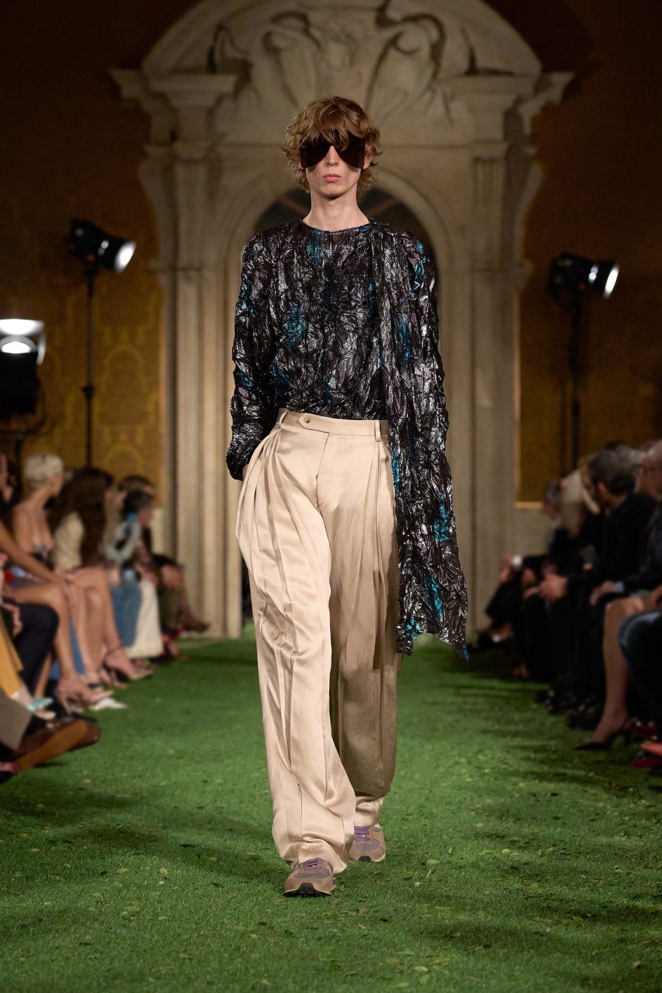 Abiti e giacche con spalline pronunciate dal mood anni '80, abbinamenti in color block, velluto, drappeggi nel tessuto e profili in pelliccia sfilano sulla passerella di Valentino nella collezione Autunno/Inverno 2026-2027 disegnata da Alessandro Michele