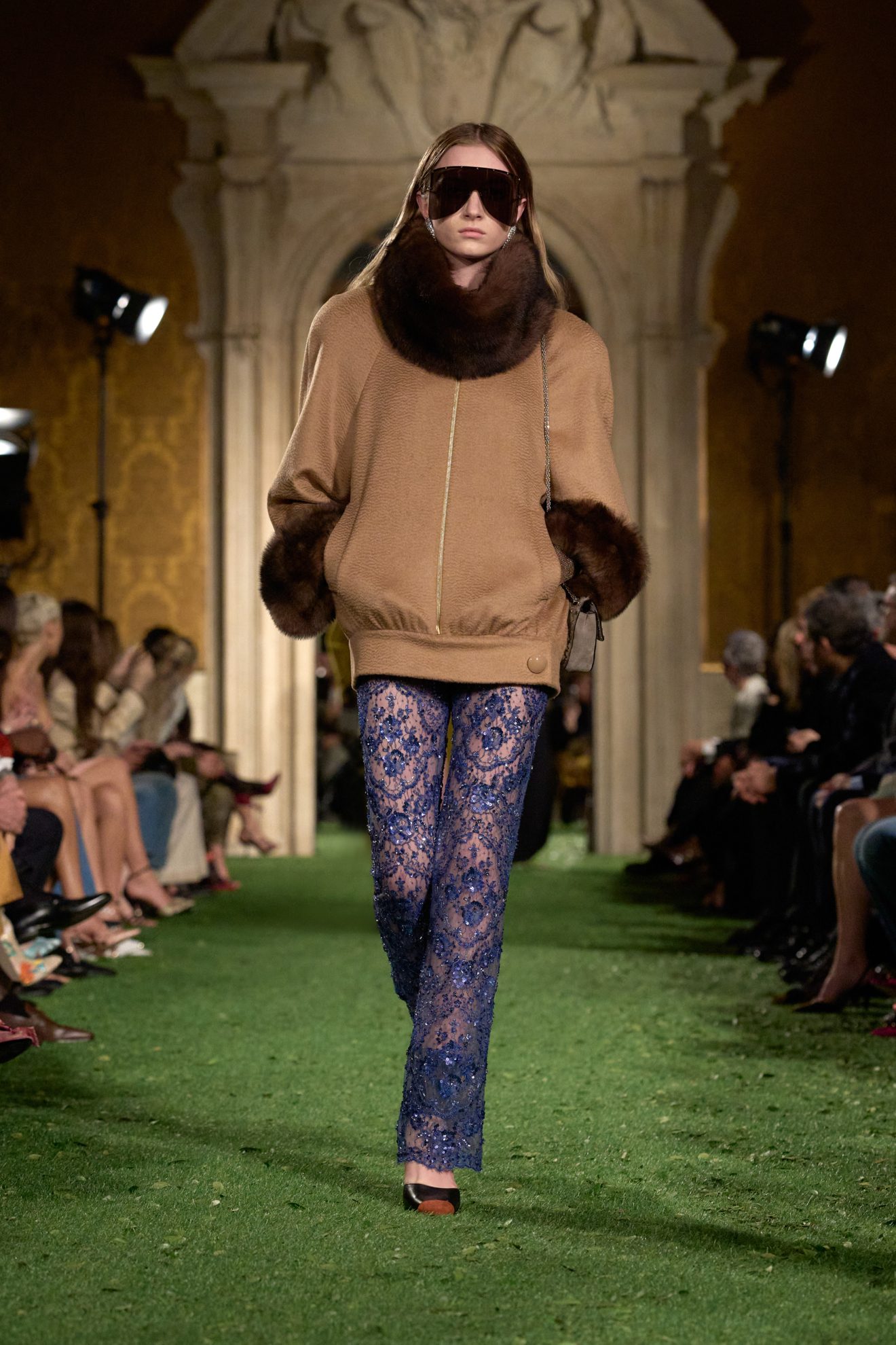 Abiti e giacche con spalline pronunciate dal mood anni '80, abbinamenti in color block, velluto, drappeggi nel tessuto e profili in pelliccia sfilano sulla passerella di Valentino nella collezione Autunno/Inverno 2026-2027 disegnata da Alessandro Michele