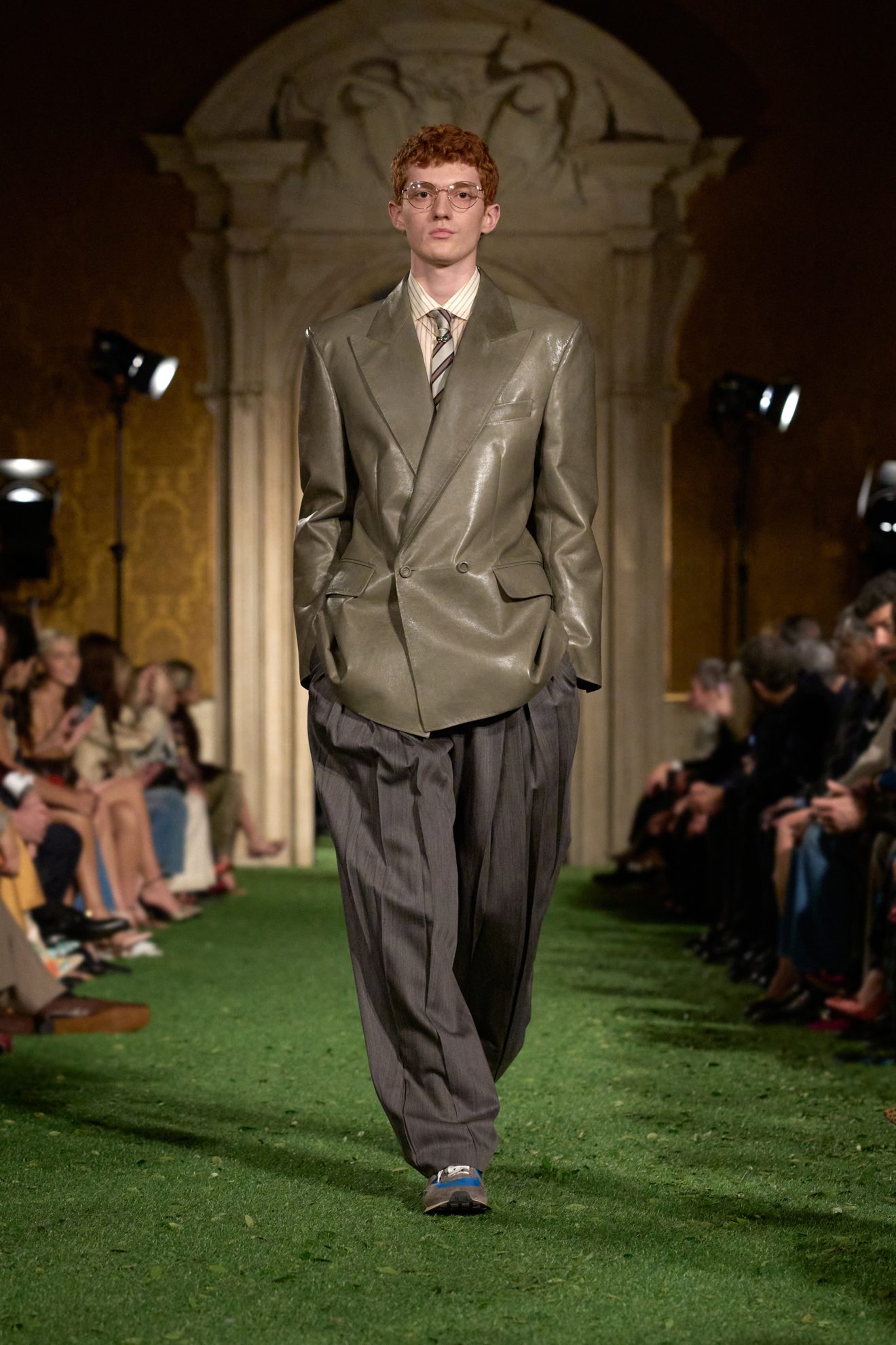 Abiti e giacche con spalline pronunciate dal mood anni '80, abbinamenti in color block, velluto, drappeggi nel tessuto e profili in pelliccia sfilano sulla passerella di Valentino nella collezione Autunno/Inverno 2026-2027 disegnata da Alessandro Michele