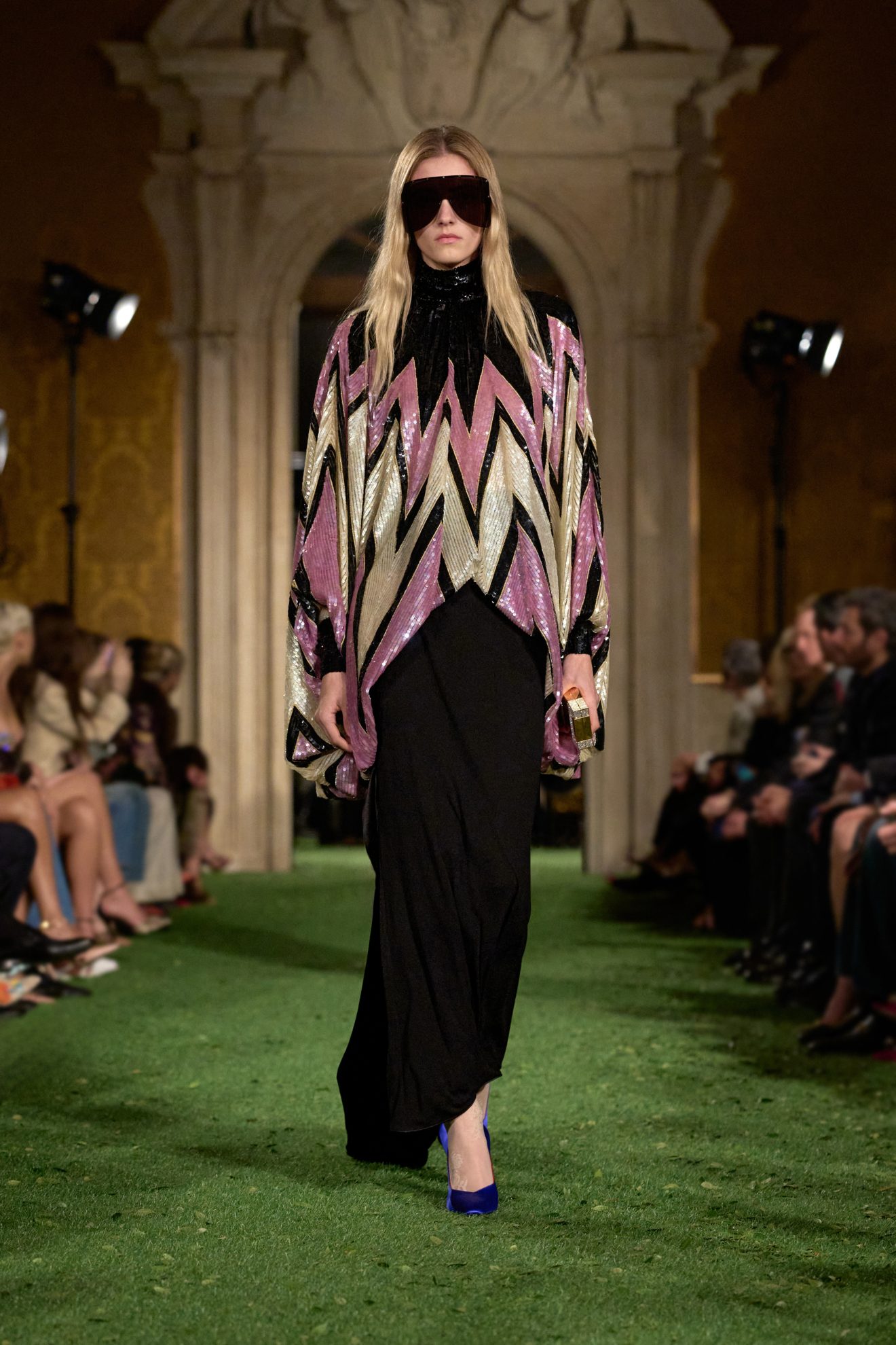 Abiti e giacche con spalline pronunciate dal mood anni '80, abbinamenti in color block, velluto, drappeggi nel tessuto e profili in pelliccia sfilano sulla passerella di Valentino nella collezione Autunno/Inverno 2026-2027 disegnata da Alessandro Michele