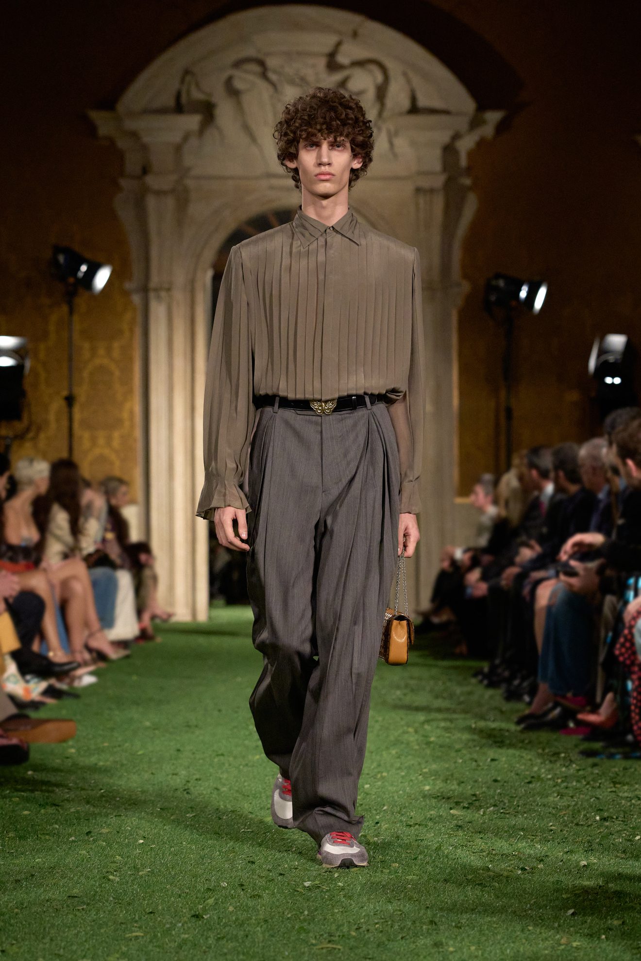Abiti e giacche con spalline pronunciate dal mood anni '80, abbinamenti in color block, velluto, drappeggi nel tessuto e profili in pelliccia sfilano sulla passerella di Valentino nella collezione Autunno/Inverno 2026-2027 disegnata da Alessandro Michele