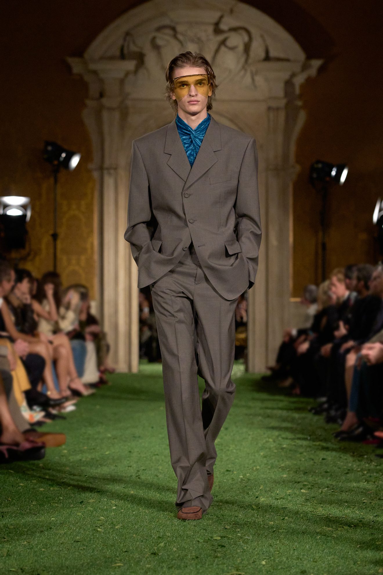 Abiti e giacche con spalline pronunciate dal mood anni '80, abbinamenti in color block, velluto, drappeggi nel tessuto e profili in pelliccia sfilano sulla passerella di Valentino nella collezione Autunno/Inverno 2026-2027 disegnata da Alessandro Michele