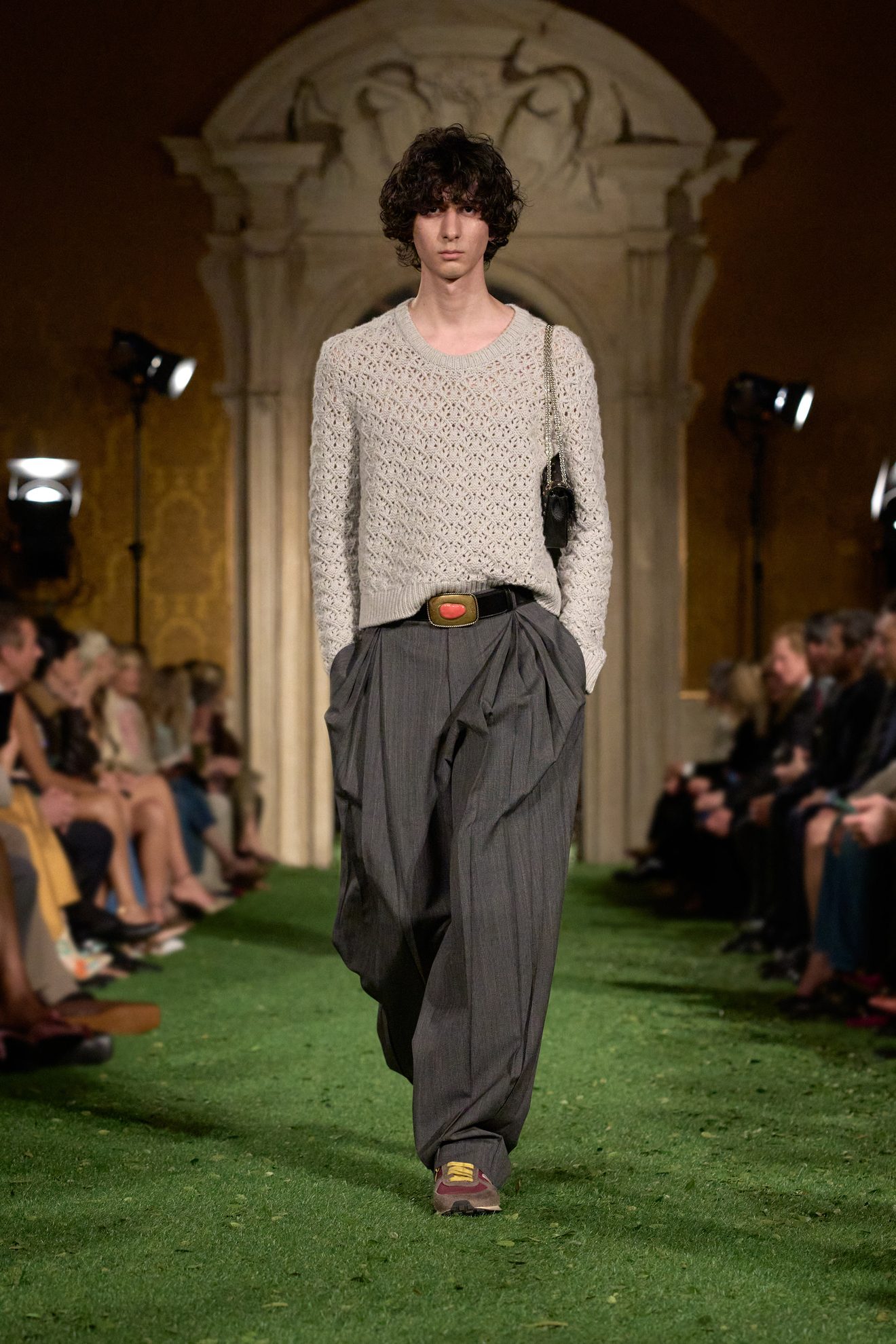 Abiti e giacche con spalline pronunciate dal mood anni '80, abbinamenti in color block, velluto, drappeggi nel tessuto e profili in pelliccia sfilano sulla passerella di Valentino nella collezione Autunno/Inverno 2026-2027 disegnata da Alessandro Michele