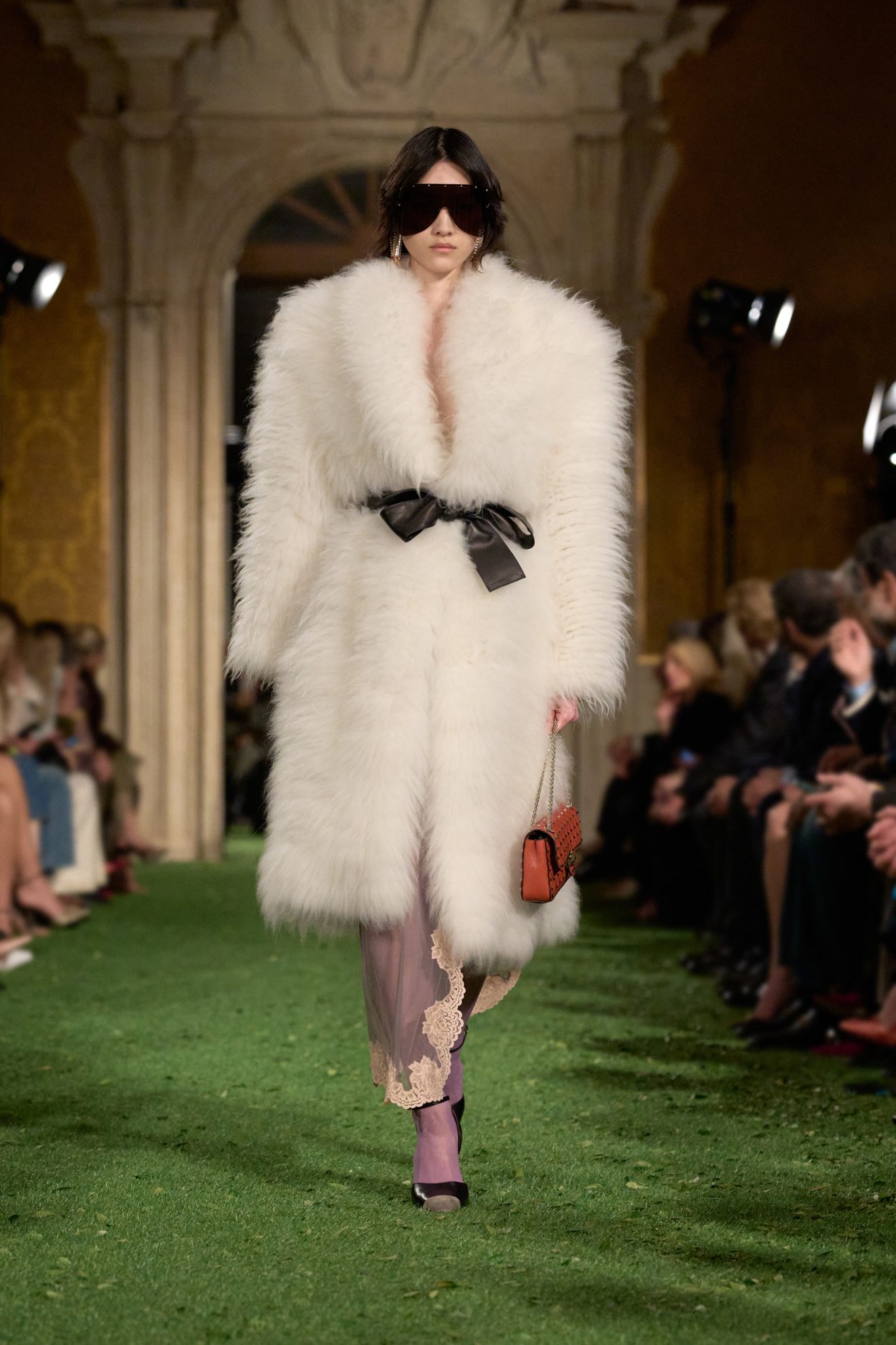 Abiti e giacche con spalline pronunciate dal mood anni '80, abbinamenti in color block, velluto, drappeggi nel tessuto e profili in pelliccia sfilano sulla passerella di Valentino nella collezione Autunno/Inverno 2026-2027 disegnata da Alessandro Michele