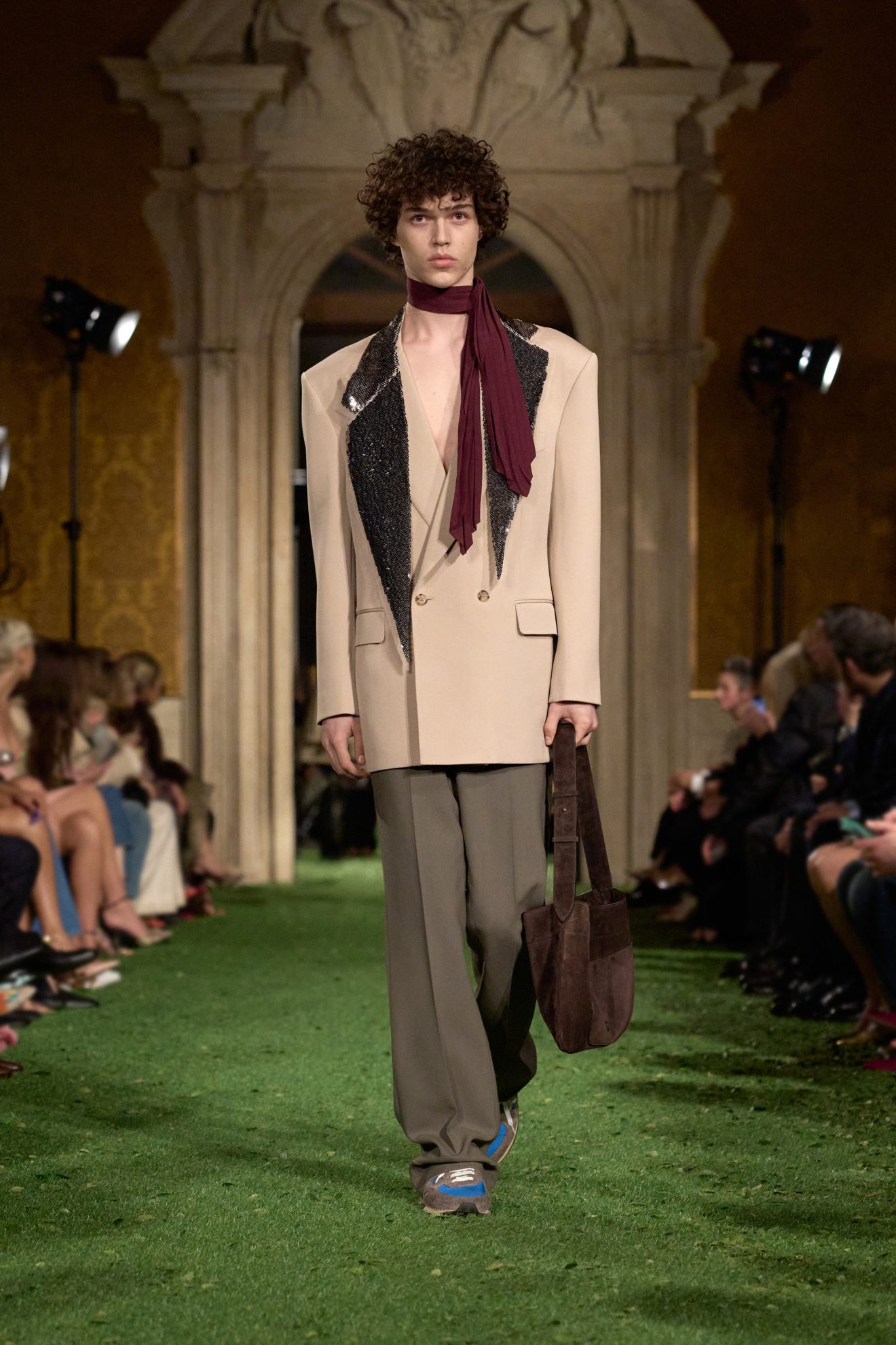 Abiti e giacche con spalline pronunciate dal mood anni '80, abbinamenti in color block, velluto, drappeggi nel tessuto e profili in pelliccia sfilano sulla passerella di Valentino nella collezione Autunno/Inverno 2026-2027 disegnata da Alessandro Michele