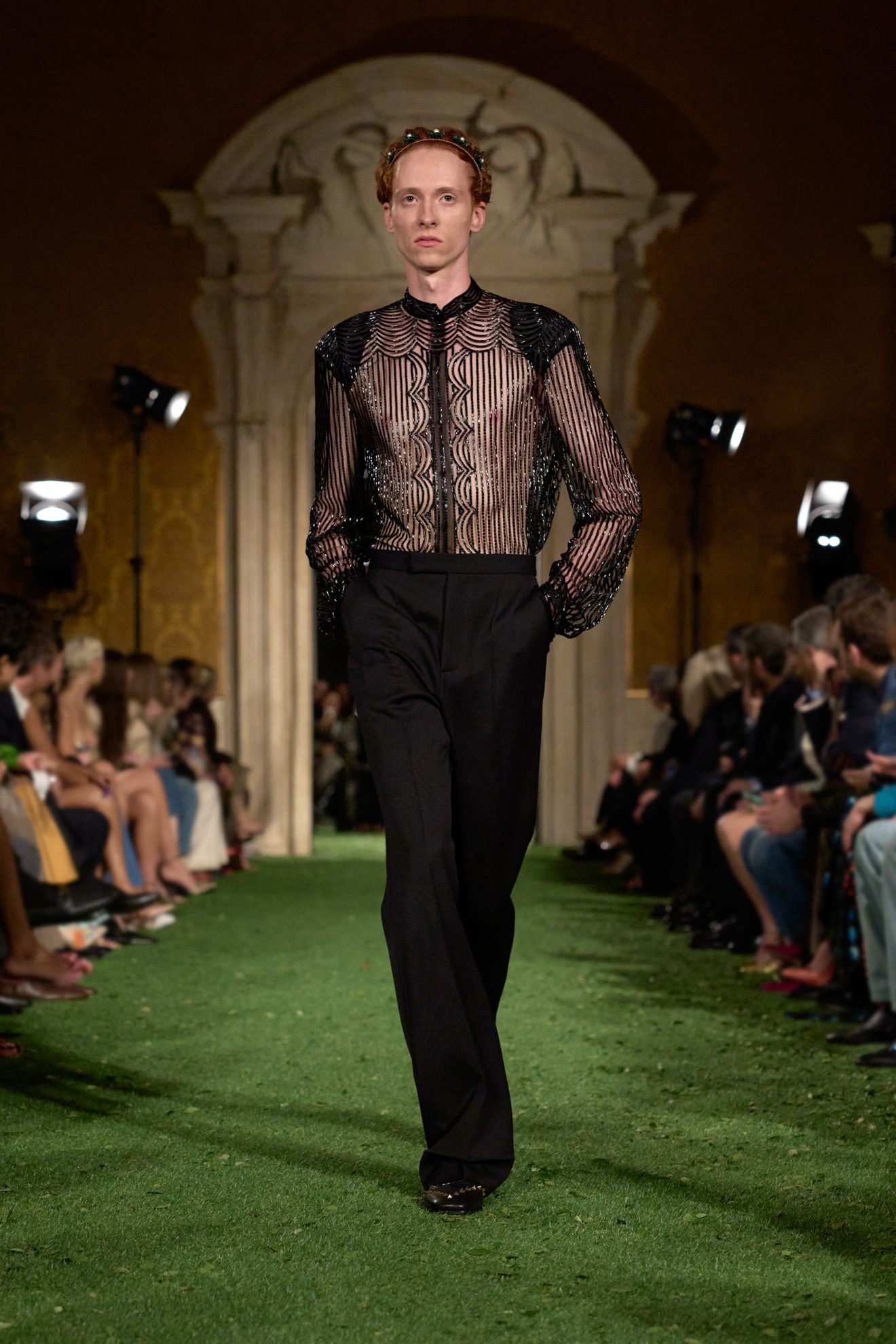 Abiti e giacche con spalline pronunciate dal mood anni '80, abbinamenti in color block, velluto, drappeggi nel tessuto e profili in pelliccia sfilano sulla passerella di Valentino nella collezione Autunno/Inverno 2026-2027 disegnata da Alessandro Michele