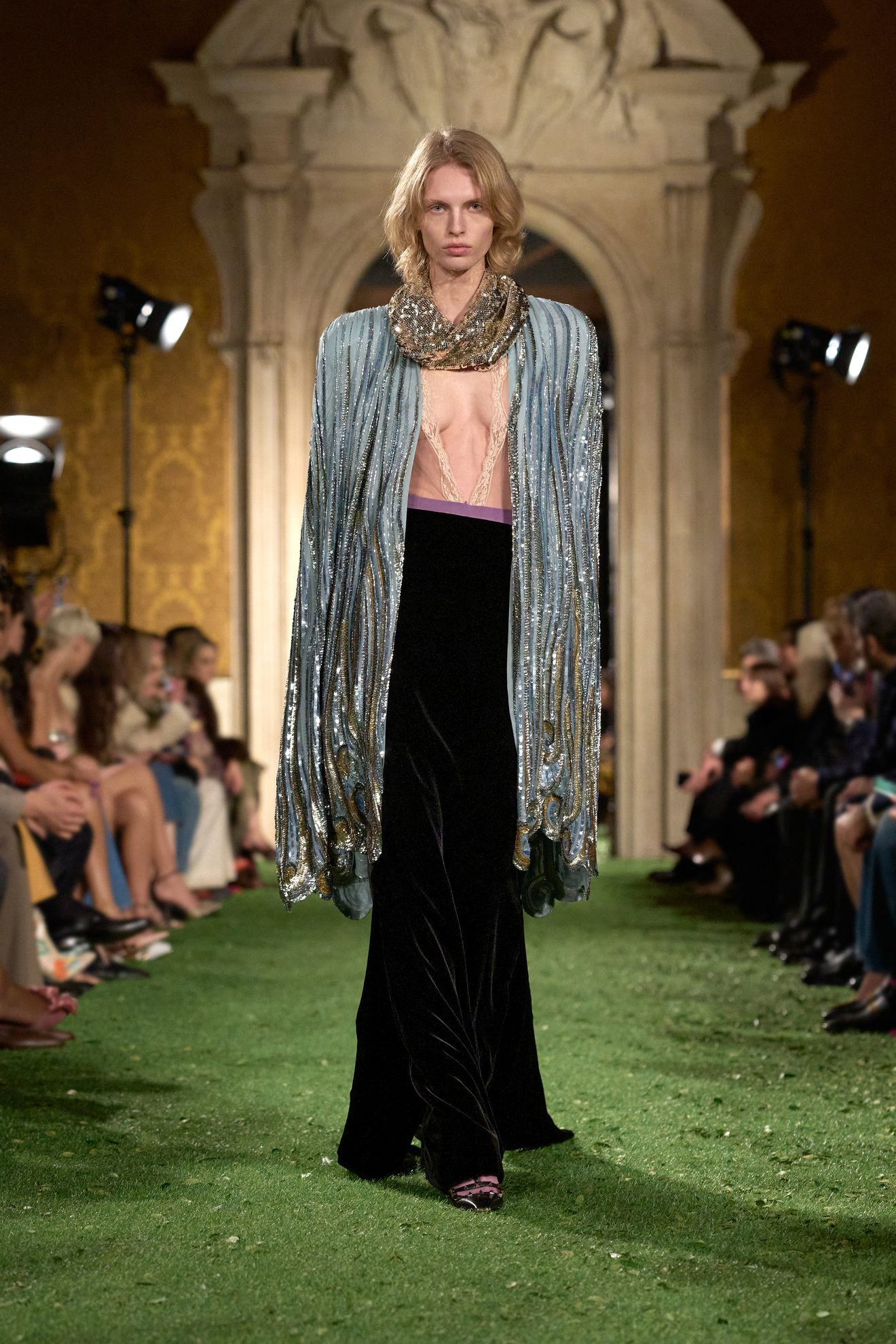 Abiti e giacche con spalline pronunciate dal mood anni '80, abbinamenti in color block, velluto, drappeggi nel tessuto e profili in pelliccia sfilano sulla passerella di Valentino nella collezione Autunno/Inverno 2026-2027 disegnata da Alessandro Michele