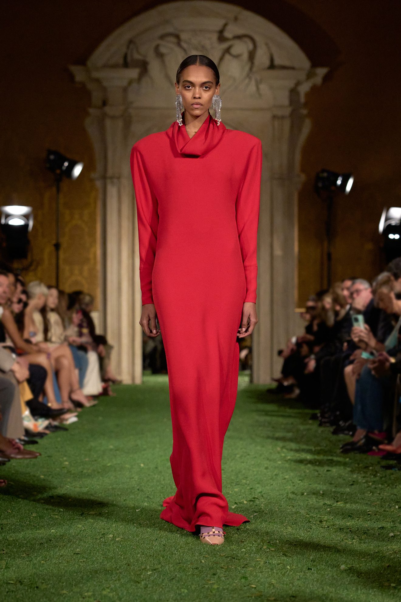 Abiti e giacche con spalline pronunciate dal mood anni '80, abbinamenti in color block, velluto, drappeggi nel tessuto e profili in pelliccia sfilano sulla passerella di Valentino nella collezione Autunno/Inverno 2026-2027 disegnata da Alessandro Michele