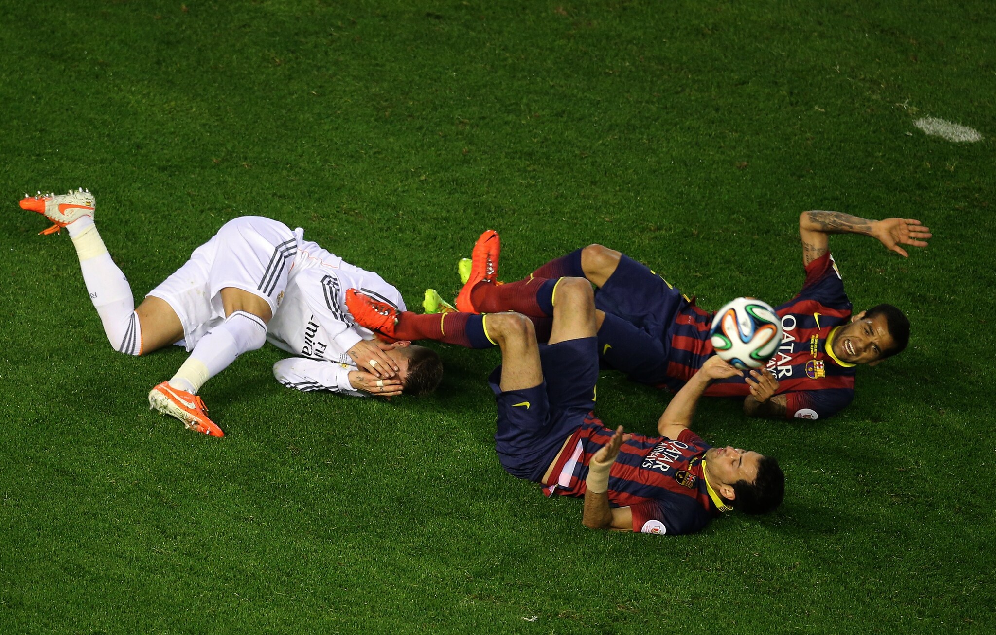 Ramos abbattuto da Busquets e Dani Alves
