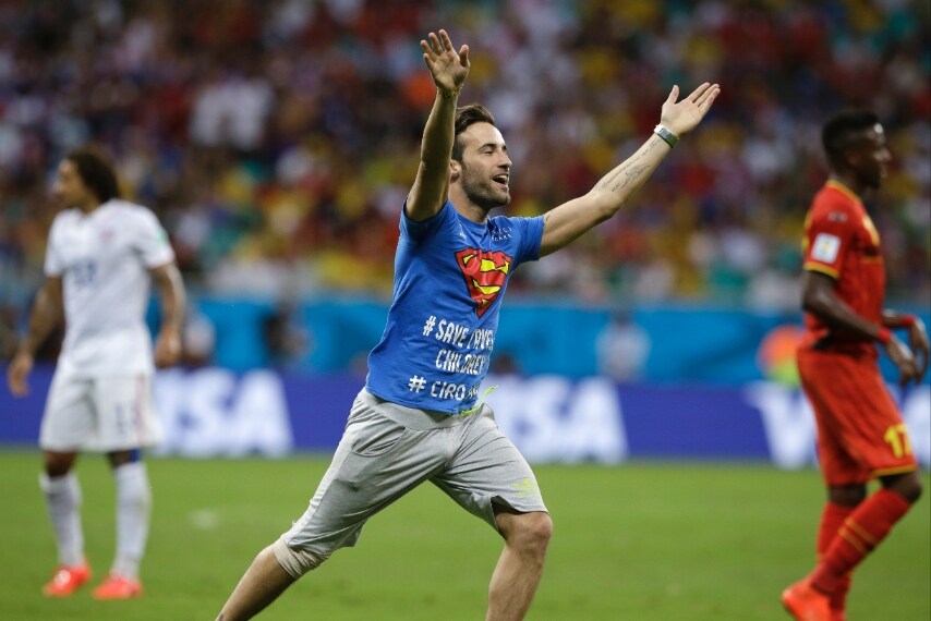 Lo aveva fatto nel 2010, s'è ripetuto nel 2014: Mario Ferri, alias il 'falco' s'è fiondato in campo durante la partita del Mondiale in Brasile tra Belgio e Usa. Indossava la maglia Superman sulla quale recava la scritta 'Ciro Vive', in onore del tifoso napoletano scomparso di recente.