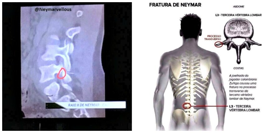 La radiografia fatta a Neymar mostra la frattura della terza vertebra lombare